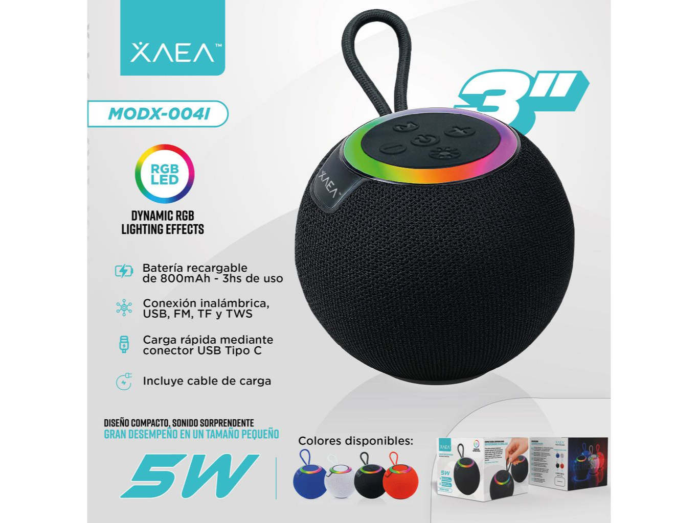 Parlante inalámbrico compacto con sonido potente de 5W y luces RGB dinámicas. Incluye batería recargable de 800 mAh (hasta 3 hs de uso), conexión Bluetooth, USB, FM, TF y función TWS. Carga rápida por USB Tipo C. Ideal para llevar a todos lados y disfrutar tu música con estilo.