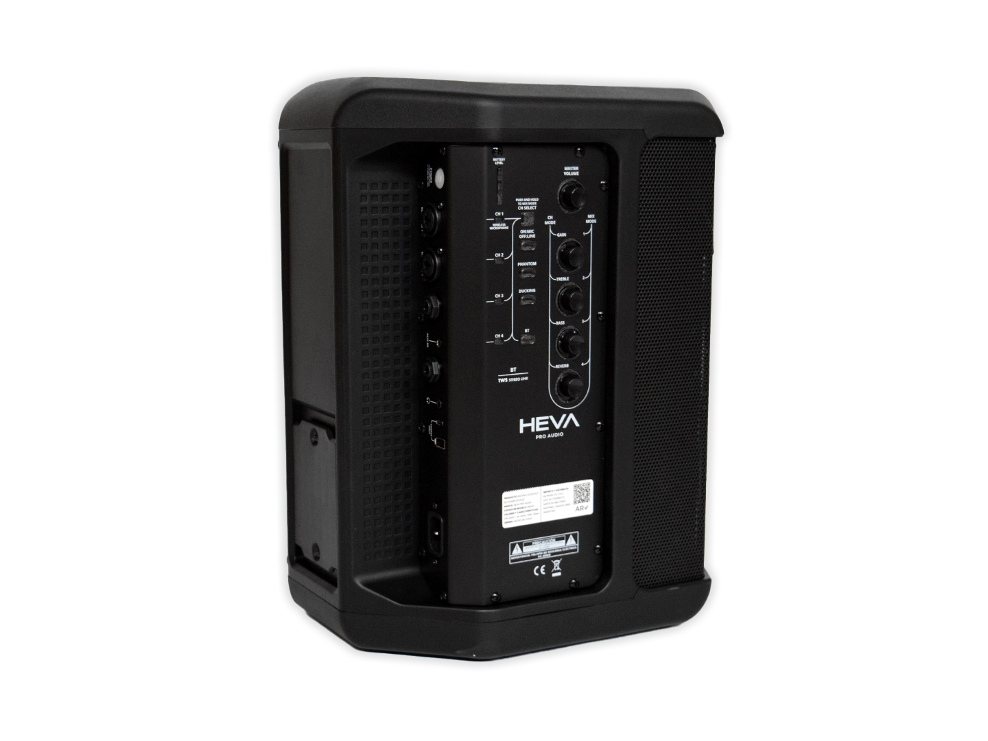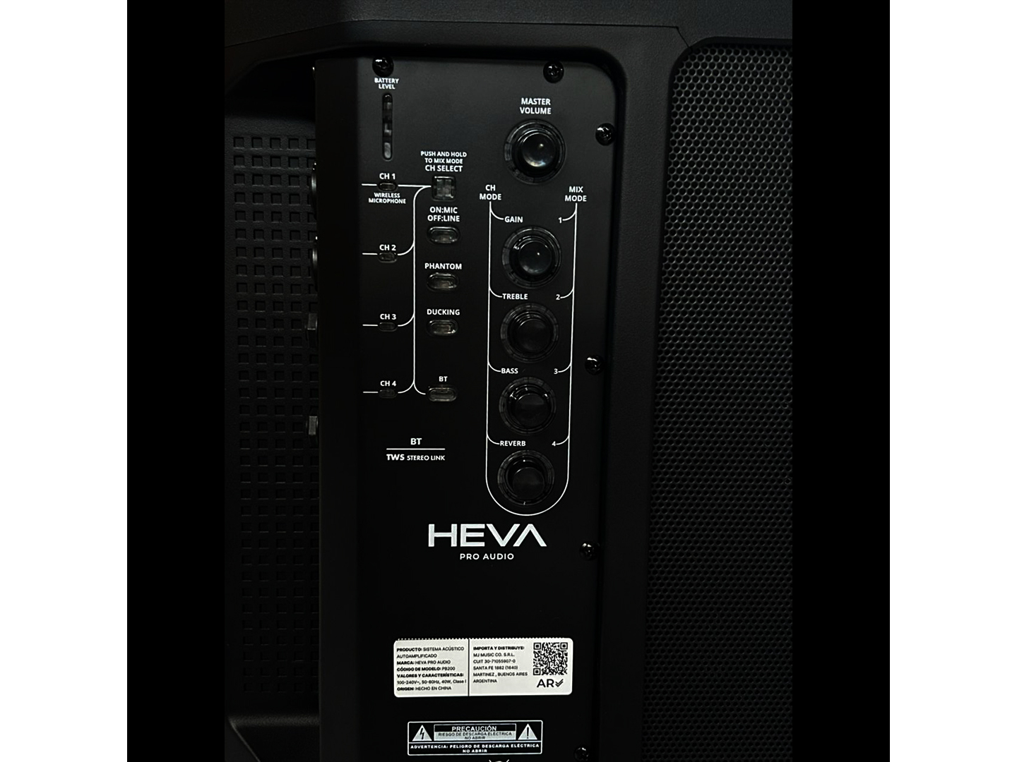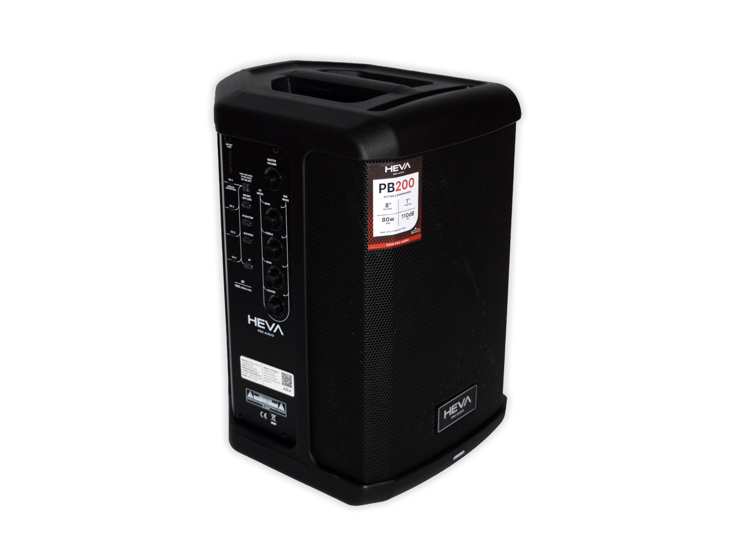 El HEVA Pro Audio PB200 es un bafle activo portátil de 8 pulgadas con batería recargable, Bluetooth, 80W RMS, mezcladora de 4 canales y función TWS Stereo Link, ideal para uso portátil o eventos pequeños.