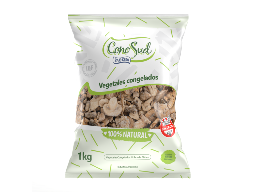 Champiñones frescos, seleccionados y cortados en fetas. Congelados por sistema IQF.