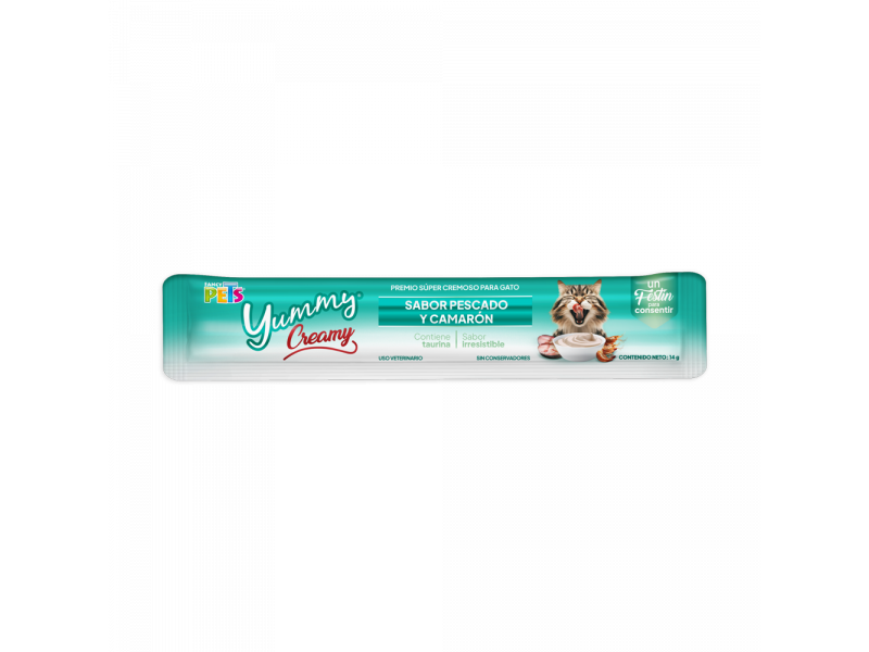 Consiente a tu gato con Yummy Creamy, la línea de premios cremosos diseñados para deleitar su paladar y complementar su alimentación de manera saludable. Su textura suave y cremosa los hace irresistibles, ideales para ofrecer directamente desde el sobre, en el plato o como complemento al alimento seco. Disponibles en tres deliciosos sabores: Salmón, Atún y Pescado con camarón, todos elaborados con ingredientes de alta calidad que aportan beneficios nutricionales. Proteína min: 8%Grasa cruda: 0.5%Fibra máx: 2%Ceniza máx: 2%Humedad máx: 85%