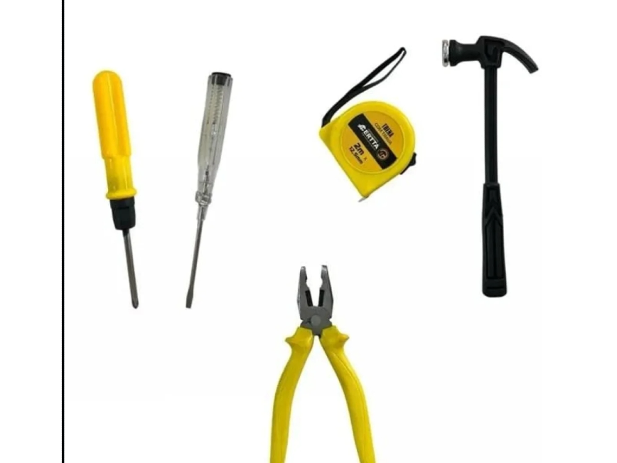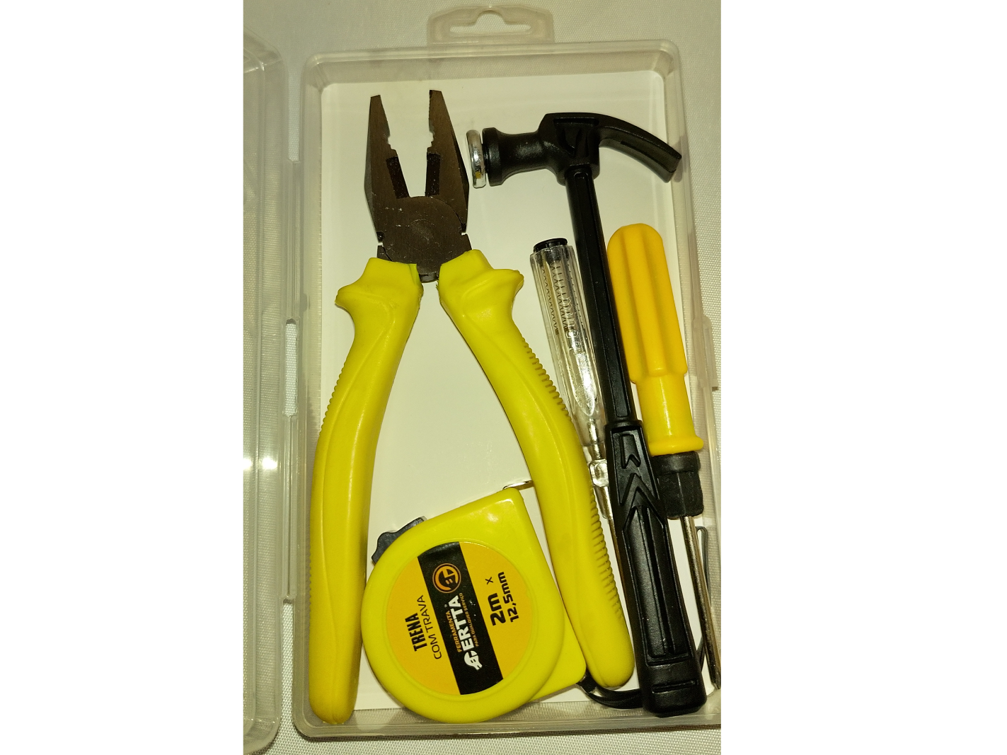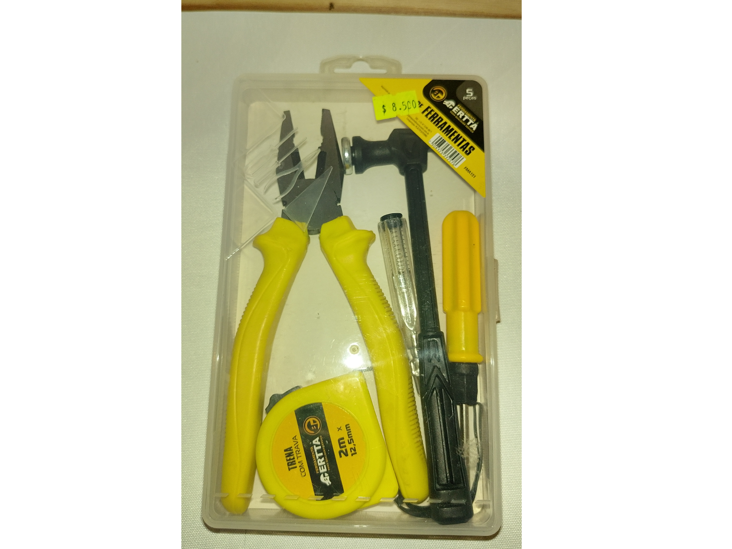 Kit de herramientas 5 pcs con caja incluida Compartir Última unidad Kit de Herramientas 5 Pcs Pinza Destornillador Busca fase destornillador Cinta metrica Martillo liviano Accesorios: Caja de resguardo incluido$8.500 Observaciones 0 / 150