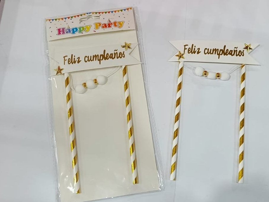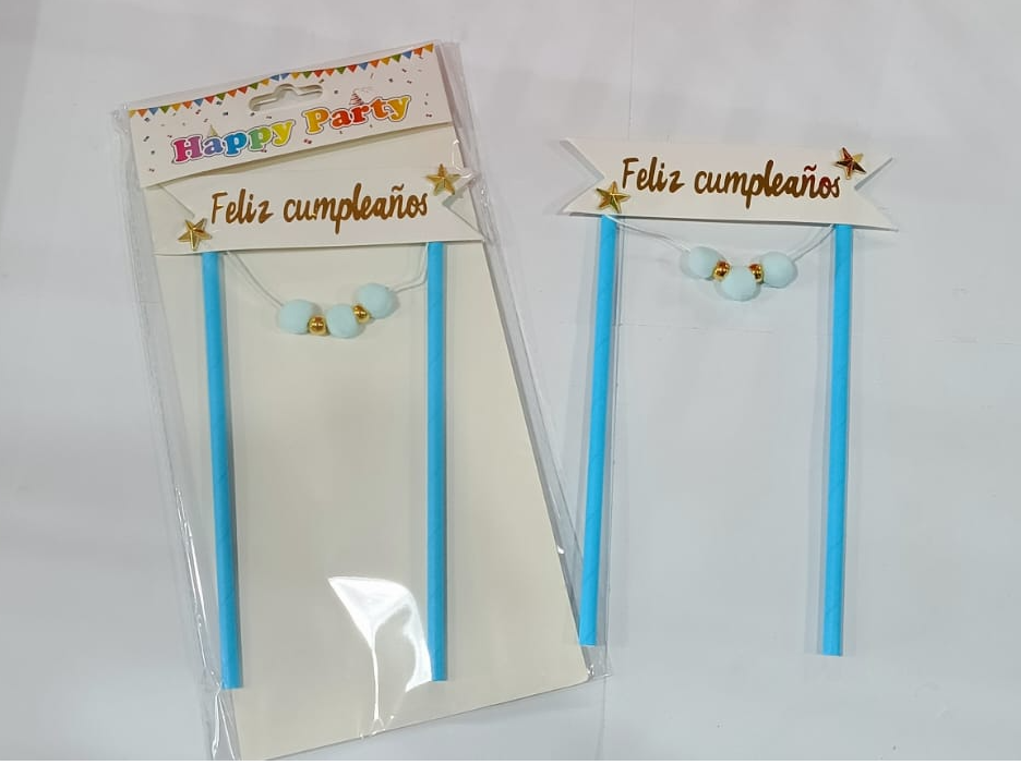 CAKE TOPPER BANDERIN FELIZ CUMPLE CON POMPONES SURTIDOS X UN