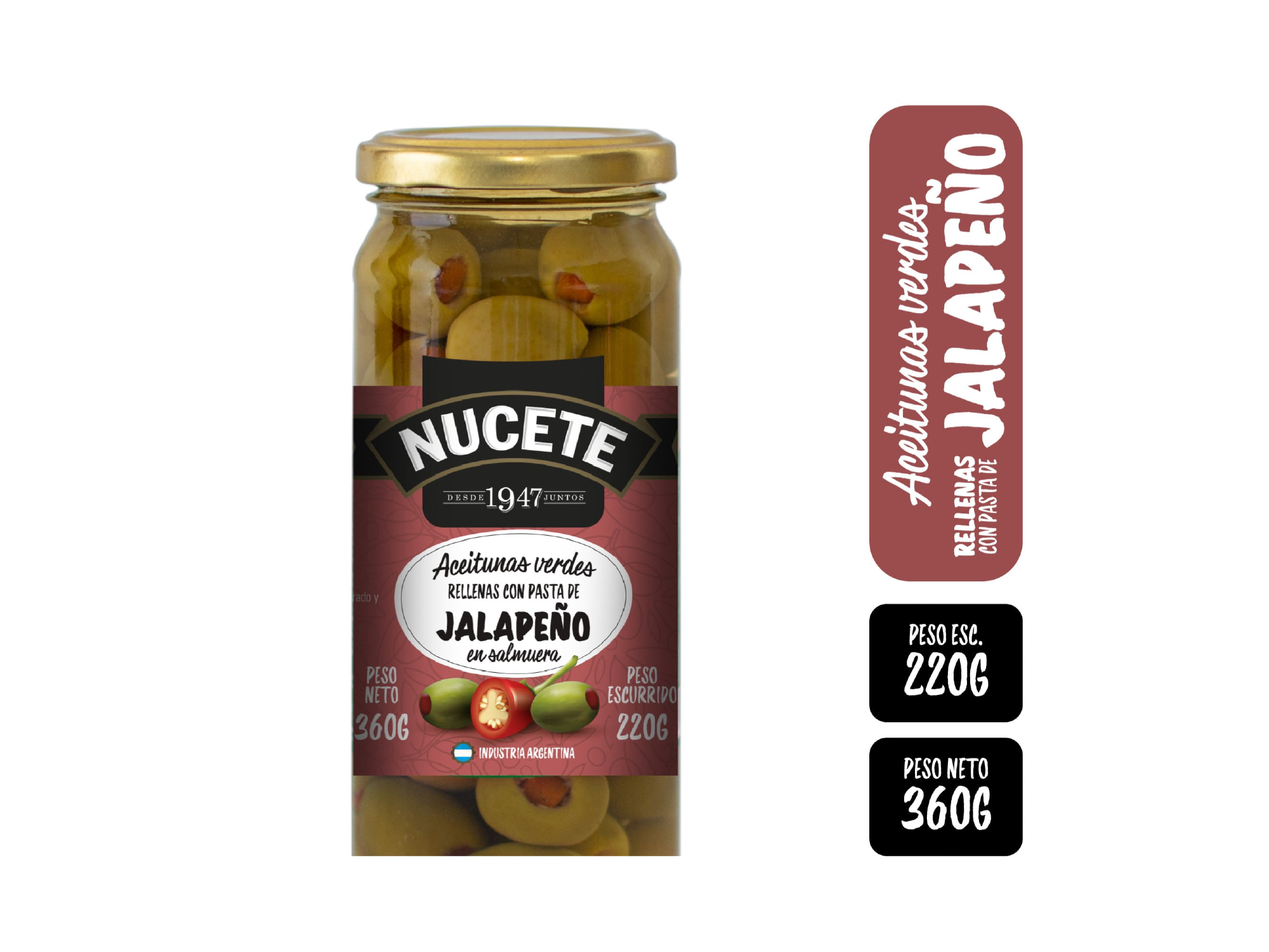 ACEITUNA NUCETE RELL JALAPEÑO F 330Aceitunas verdes Nucete rellenas con jalapeño en frasco 330 g.$4.439 Observaciones 0 / 150