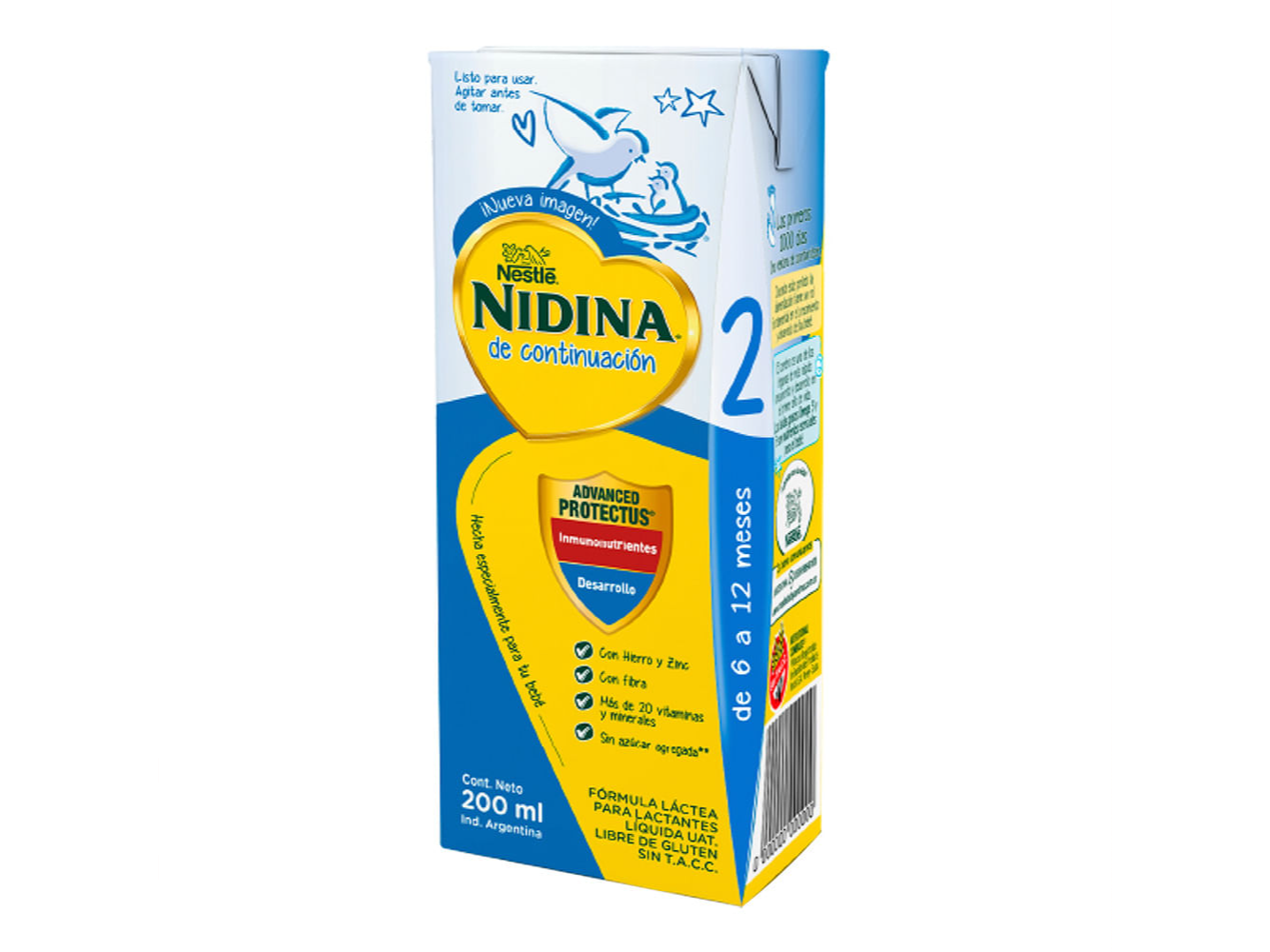 Unidad de 200 mililitros Nidina® 2 de continuación (6 a 12 meses) con Hierro y Zinc, fibra y más de 20 vitaminas y minerales. Sin azúcar agregada. Los ácidos grasos Omega 3 y 5 son nutrientes esenciales. ¡Lista para tomar! Fórmula láctea para lactantes líquida UAT - Libre de gluten. Contiene lactosa<br/> <br/> La leche materna sigue siendo la mejor leche para tu bebé hasta por lo menos los dos años de vida. Producto solo es adecuado para lactantes mayores de 6 meses y como parte de una dieta diversificada. No debe utilizarse durante los primeros 6 meses de vida.<br/> <br/> Conservación: Mantener el envase cerrado en un lugar fresco y seco. No exponer a a luz solar. Consumir antes de la fecha indicada en el envase. Una vez abierto el envase, consumir y desechar el resto. No consumir si el envase se encuentra dañado. Evitar el almacenamiento prolongado a temperatura excesiva.<br/><br/>Fabricante: Nestlé Marca: Nidina® Línea: Nidina Formato de la FI: Liquida Tipo de Envase: Brick Unidades x Envase: 1 Peso de la Unidad: 200ml Volumen de la Unidad Edad Mínima recomendada: 6 meses Edad Máxima recomendada: 12 meses Apto Prematuros: No Libre de Gluten: Sí Contiene lactosa: Sí Conservación: Evitar el almacenamiento prolongado a temperatura excesiva.