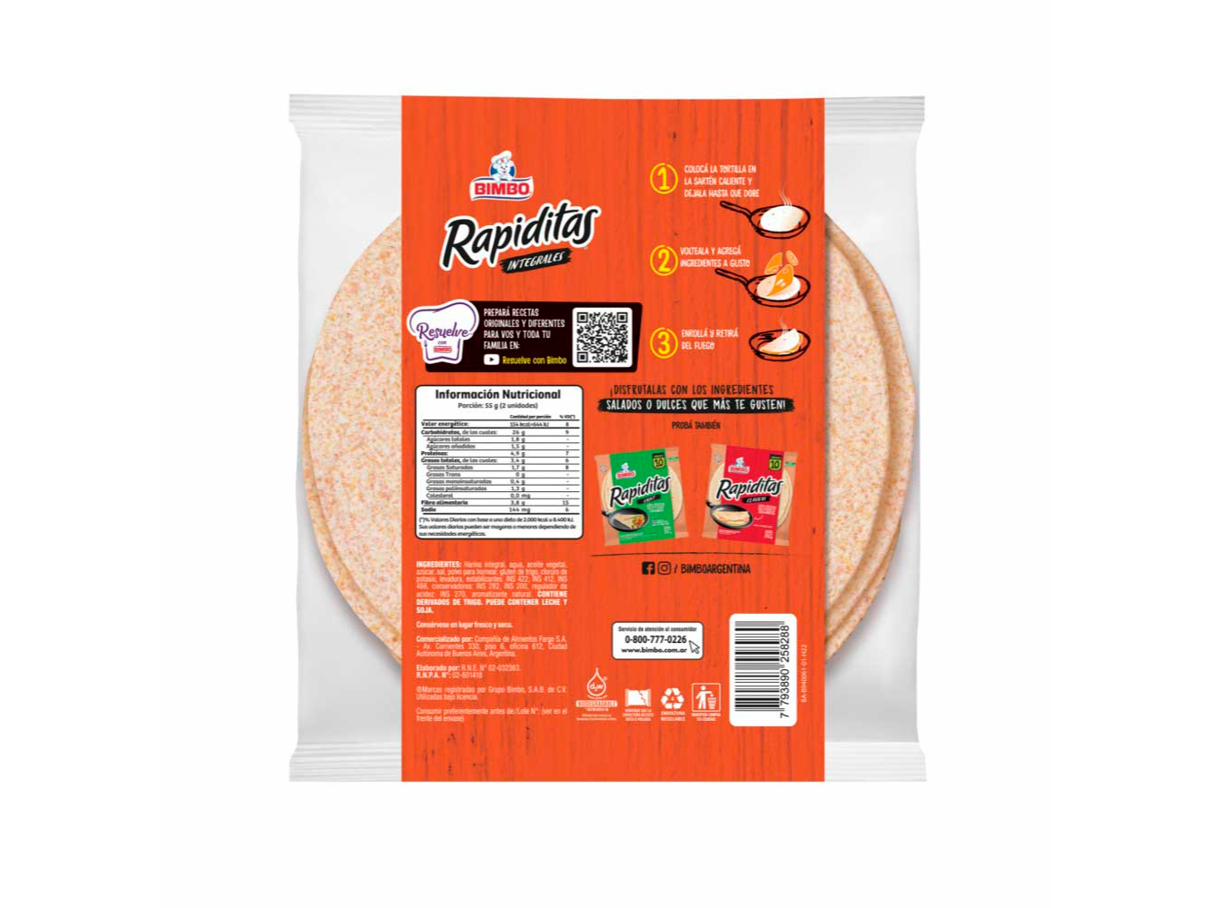 Rapiditas integral son una solución simple y versátil que permite innovar de manera creativa pero sobre todo ¡rápida! en tu cocina, para que disfrutes tus comidas aún cuando hay poco tiempo.<br/><br/>Súper prácticas para preparar en segundos. Ahora con menos sodio, fuente de fibra. Contiene 10 unidades. ¡Reutilizá este envase!<br/><br/>Harina integral, agua, aceite vegetal, azúcar, sal, polvo para hornear, gluten de trigo, cloruro de potasio, levadura, estabilizantes: INS 422, INS 412, INS 466, conservadores: INS 282, INS 200, regulador de acidez: INS 270, aromatizante natural. CONTIENE DERIVADOS DE TRIGO. PUEDE CONTENER LECHE Y SOJA.<br/><br/>