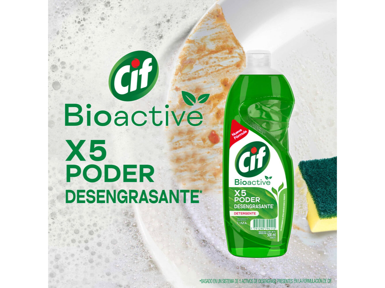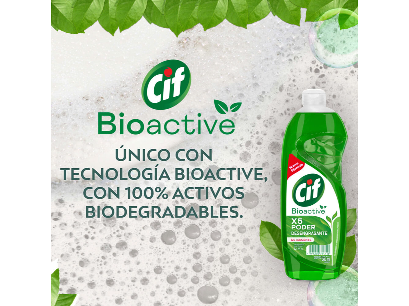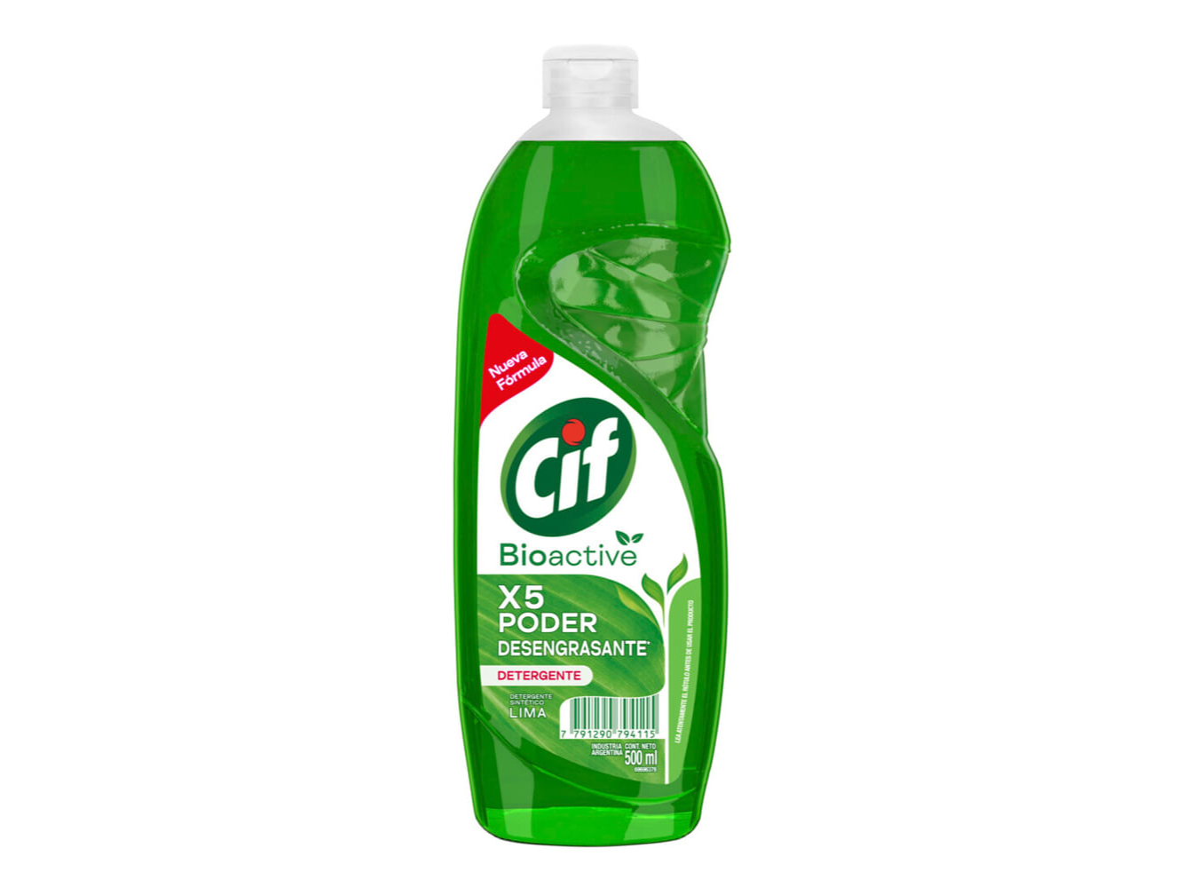 Detergente Cif Bioactive Lima 500ml <BR> <BR> Nuevo Detergente CIF Bioactive Lima (500 ml). Su nueva fórmula X5 PODER desengrasante elimina la grasa difícil desde la primera pasada, dejando toda tu vajilla limpia y brillante. Además, tiene una nueva y única tecnología BIOACTIVE, que tiene 100% activos biodegradables. El nuevo CIF BIOACTIVE trae una fragancia, que es también biodegradable y neutraliza los malos olores de toda tu vajilla. ¿Sabías que la botella del detergente Cif BioActive Lima, está hecha con plástico 100% reciclado y es también 100% reciclable, contribuyendo de este modo con el cuidado del medio ambiente? CIF evolucionó y trae su mejor fórmula: garantizando un máximo rendimiento y un cuidado total. CIF Bioactive se mantiene por más tiempo en tu esponja, garantizando una espuma de larga duración, para que con menos cantidad de producto puedas lavar muchos más platos. Para poder reutilizar la botella CIF: Lava la botella de Cif Bioactive y deséchala correctamente. Para usar el producto: Aplicá directamente tu artículo de limpieza CIF en la esponja o diluí 1 cucharada en 3 litros de agua. Una vez que hayas terminado de lavar, enjuaga tu vajilla en agua caliente o fría. ¡Con el detergente CIF Bioactive Lima podés obtener un máximo rendimiento todos los días! Conocé también su presentación CIF Recarga Económica (formato Doypack) fragancia Limón y Lima. Chau grasa, bienvenida belleza.<br><br><ul><li>Detergente CIF Bioactive Lima con nueva fórmula. El nuevo detergente CIF Bioactive garantiza un máximo rendimiento y elimina la grasa difícil desde la primera pasada. Los detergentes CIF contienen tecnología Bioactive y 100% activos biodegradables. Detergente con máximo rendimiento, gracias a su formulación X5 PODER desengrasante. Botella de detergente hecha con 100% plástico reciclado. Las fragancias biodegradables de los artículos de limpieza CIF neutralizan los malos olores, incluso de los plásticos.</li></ul>