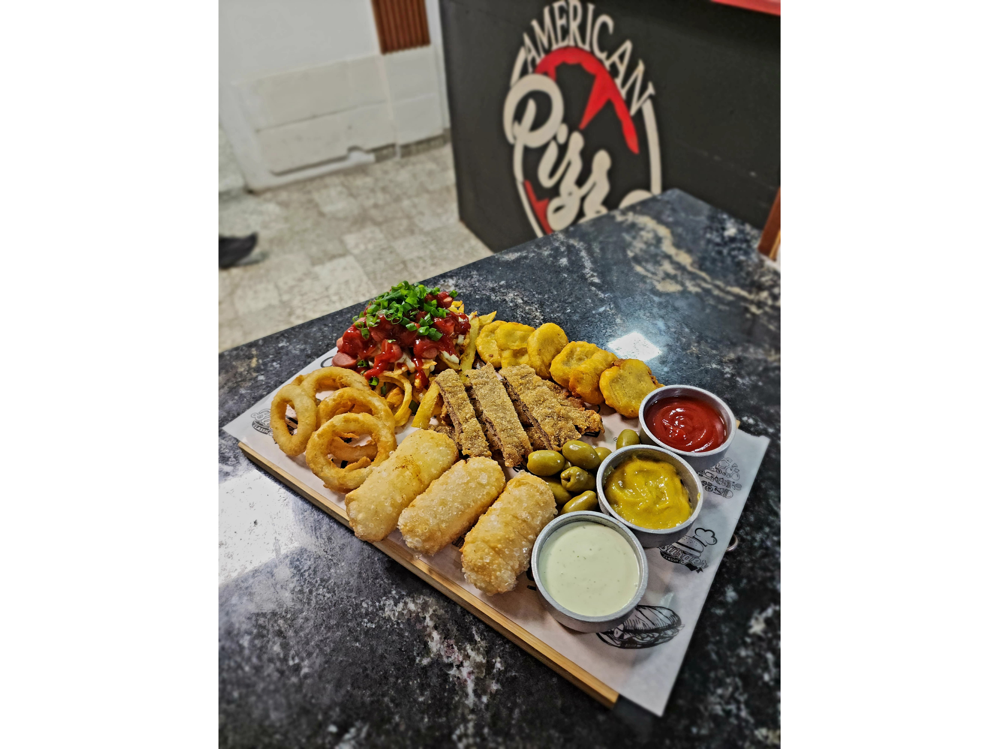 OPCIÓN 3 🫒🤤🍟 Compartir por WhatsApp Copiar enlace Bastones de Mozzarella, milanesa de carne o pollo, aros de cebolla, nuggets, salchipapa o papas simples, aceitunas, mayo americana y ketchup.$18.000 Observaciones 0 / 150 Encontrá productos relacionados LATA DE PEPSI GRATIS (7)