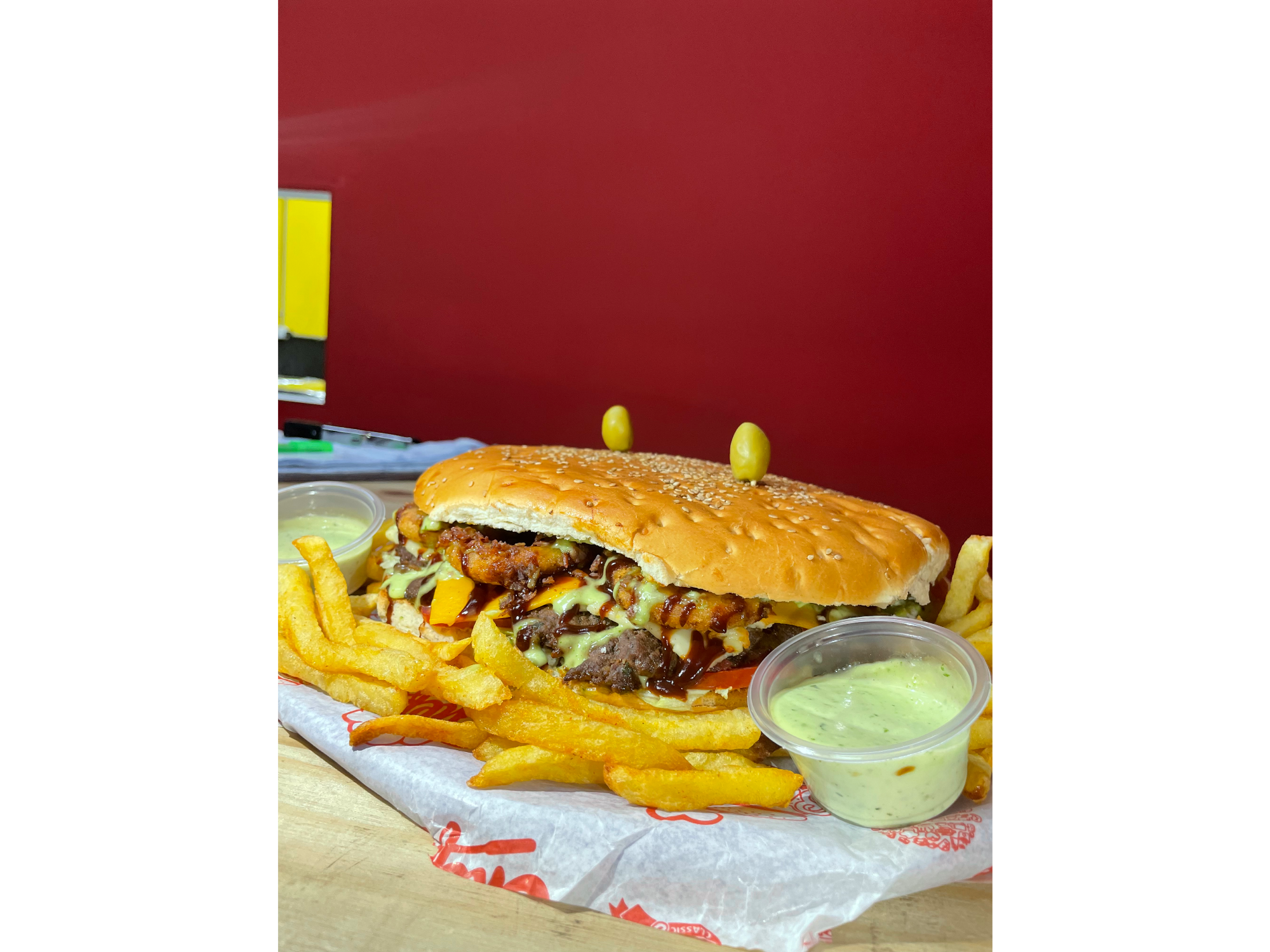 Medallón de 450gr, cheddar, panceta crocante, barcacoa y mayonesa americana. Sale con papas y 2 potes de mayo. 🍟