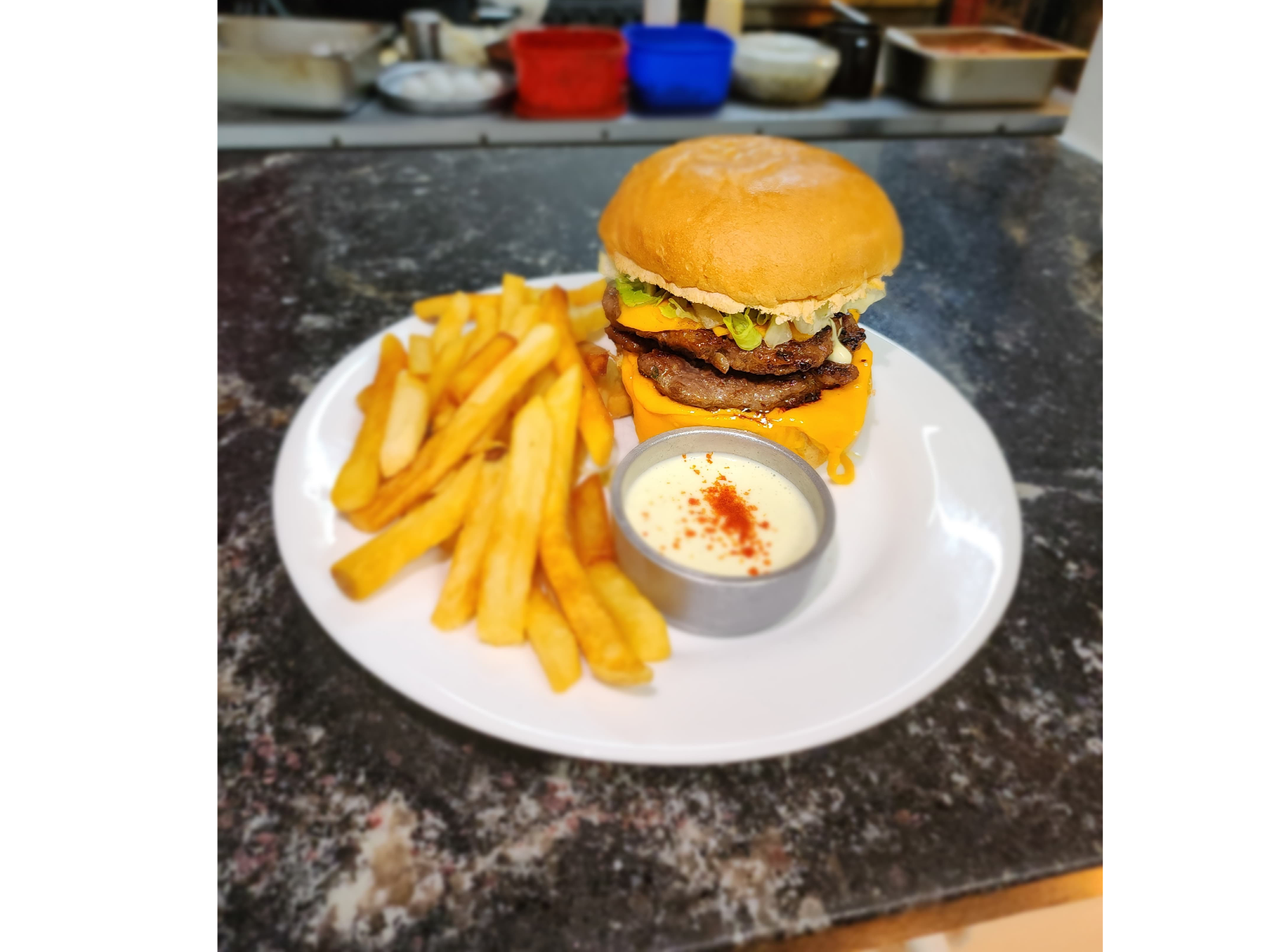 Doble medallón de carne, doble cheddar, lechuga, tomate y mayo de la casa.
