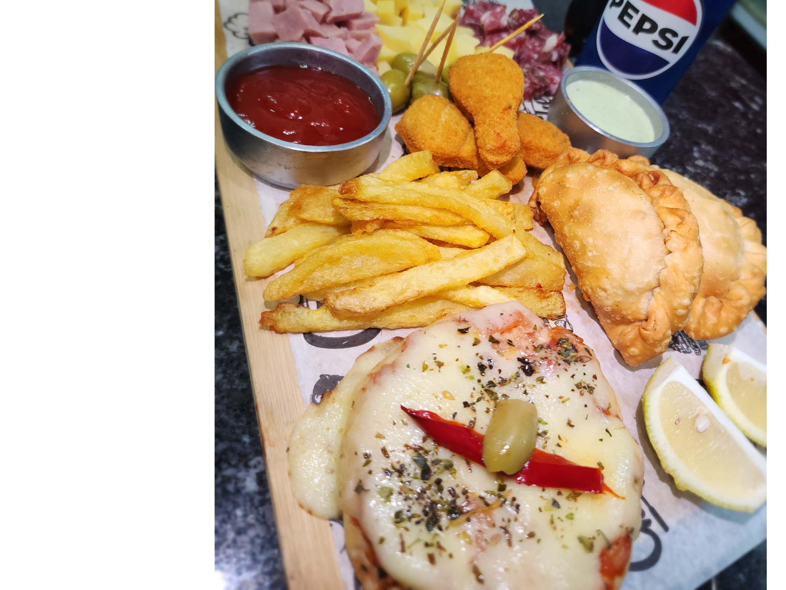 OPCIÓN 5 Compartir Empanadas de carne cortada a cuchillo, pizzeta, nuggets, papas fritas, jamón, queso, salame, aceitunas, ketchup y mayo de la casa. 🫒 🧀 🥟$12.000 Observaciones 0 / 150