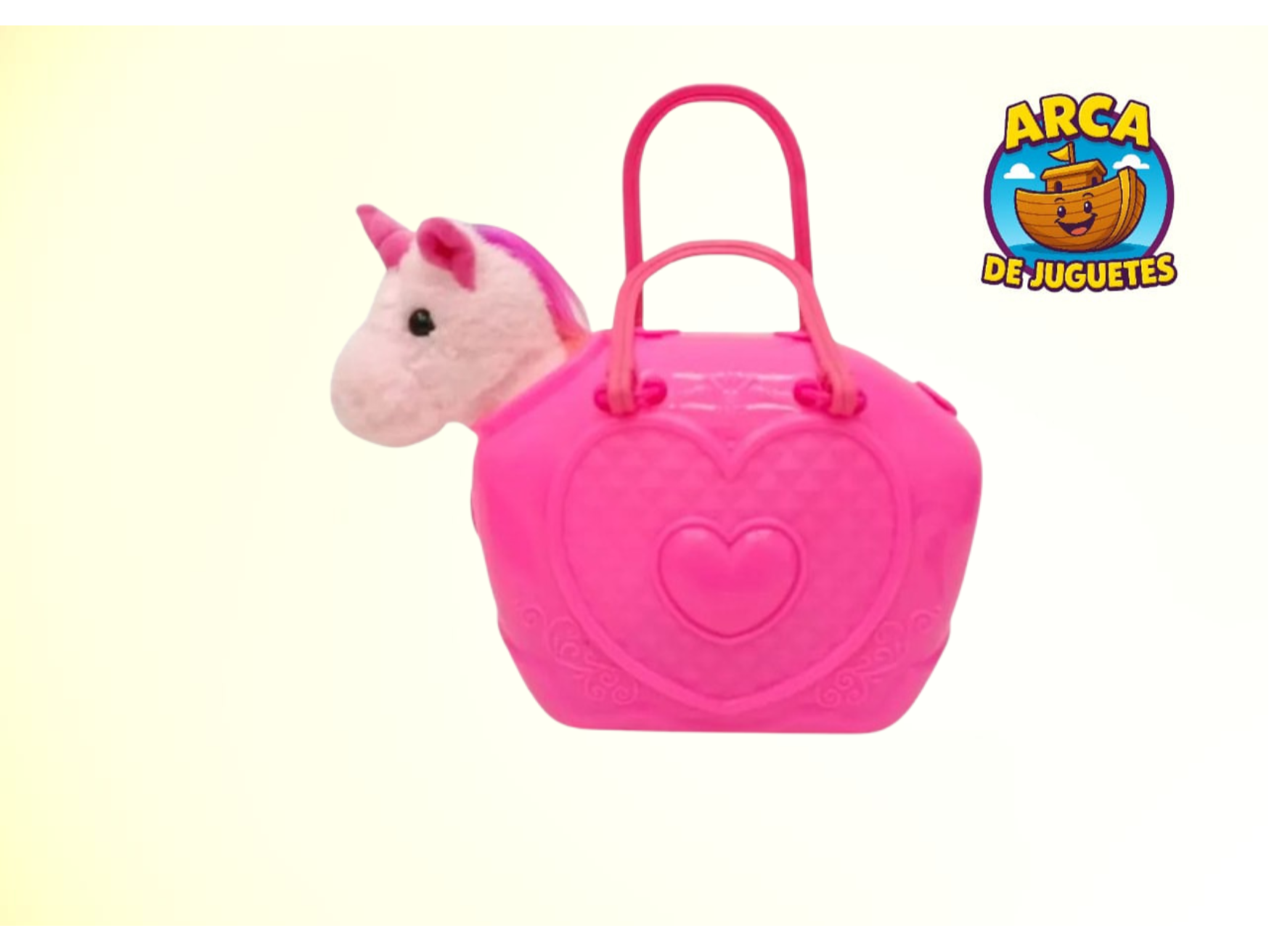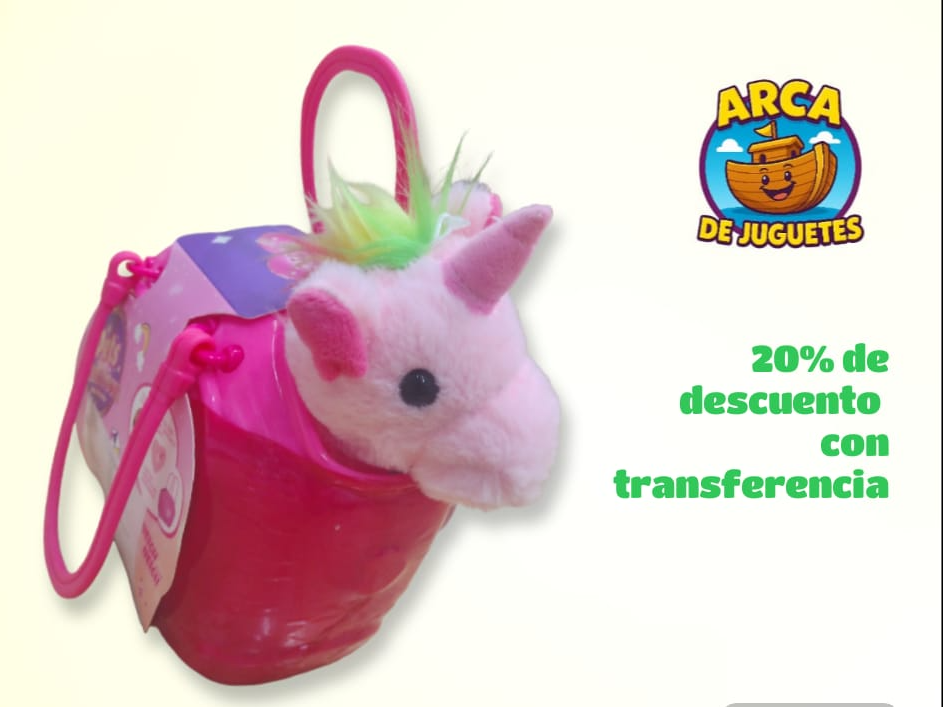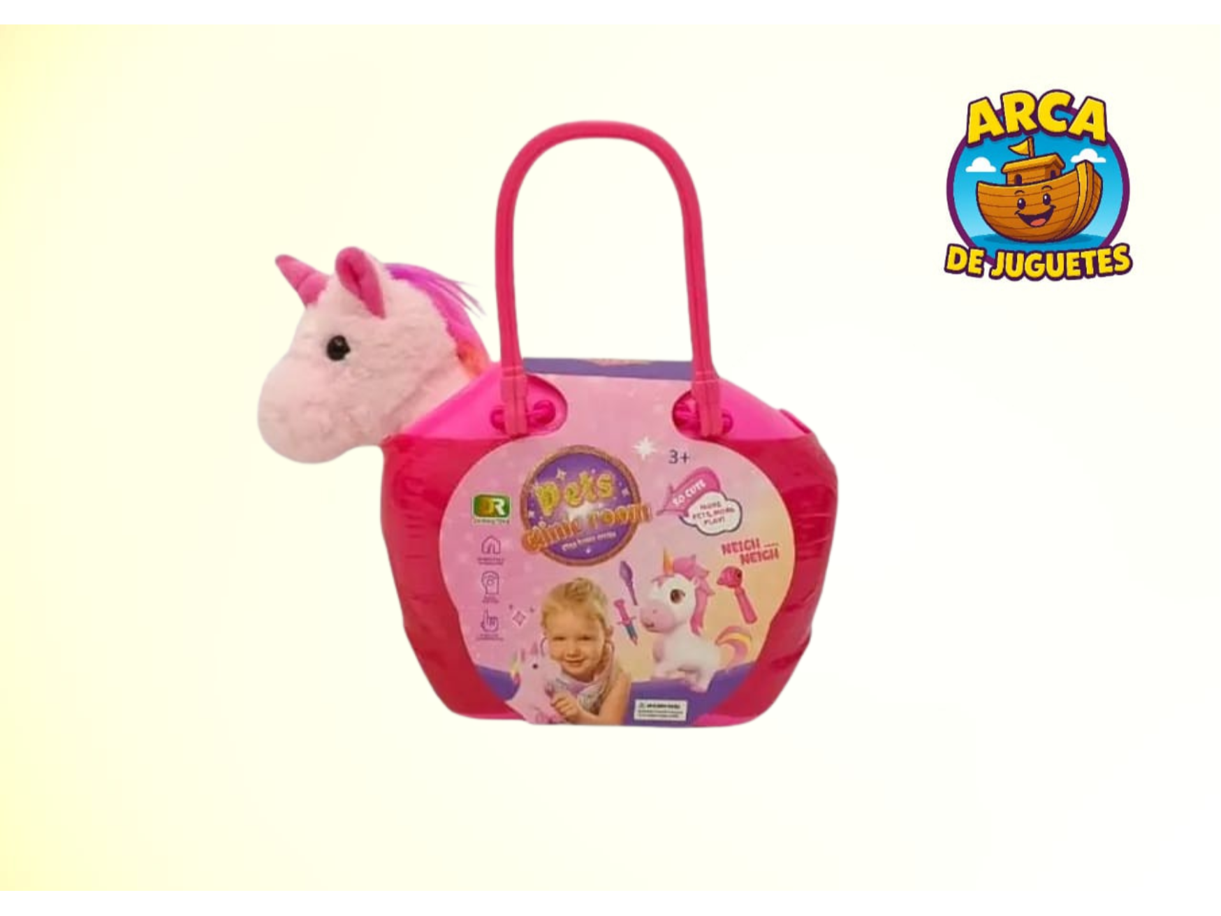 Cada set incluye un peluche suave (unicornio, gato o perro) que viene dentro de una cartera plástica de paseo, junto con accesorios para jugar al veterinario.