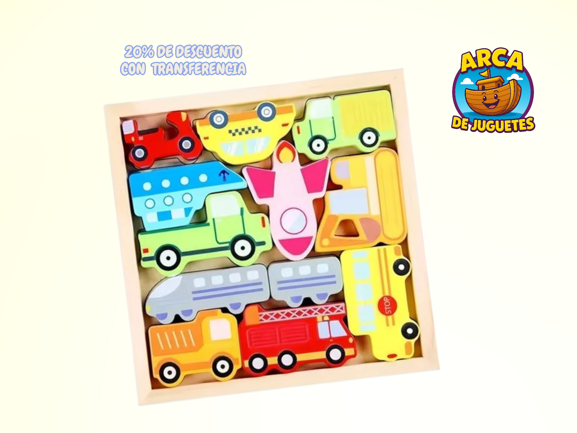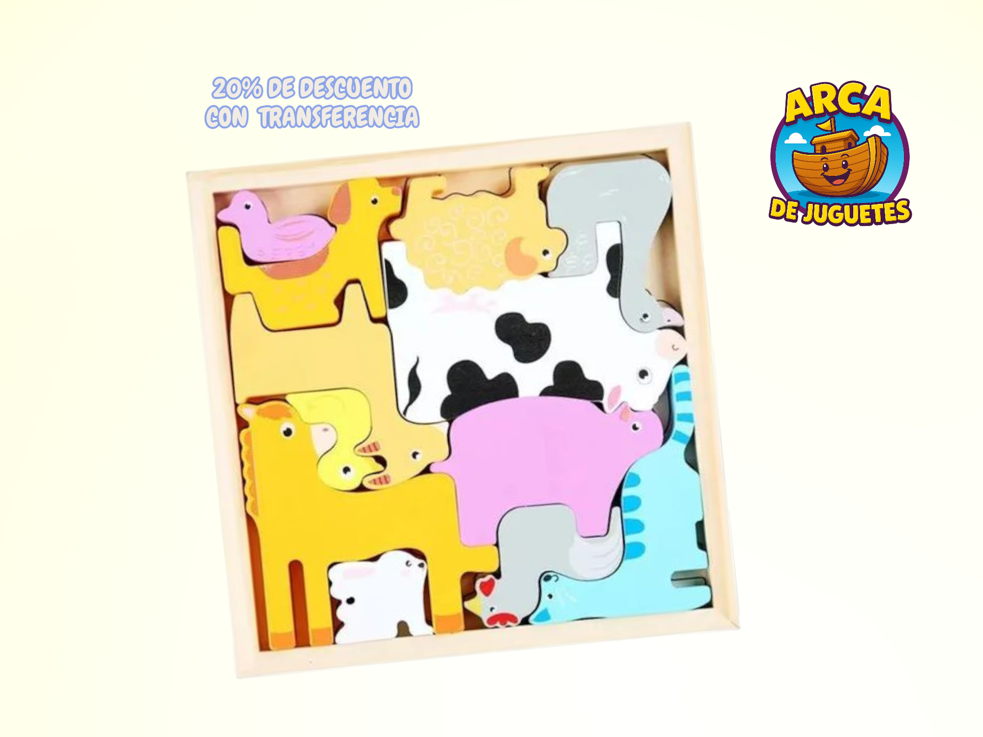 Cada set incluye piezas de madera con formas de animales o personajes según la temática. Debajo del tablero se encuentra la silueta de cada figura, para que los niños puedan encastrar y aprender jugando.