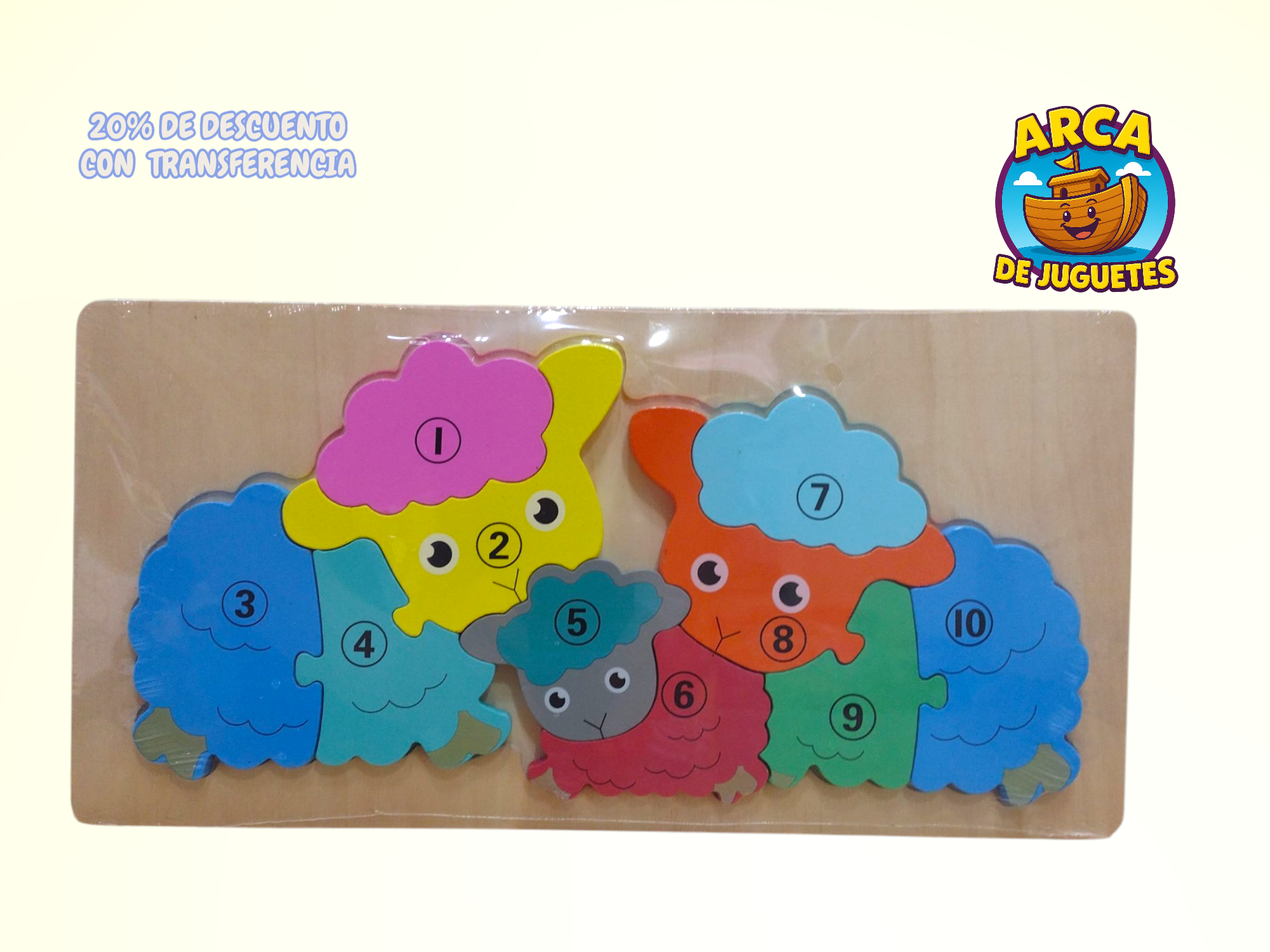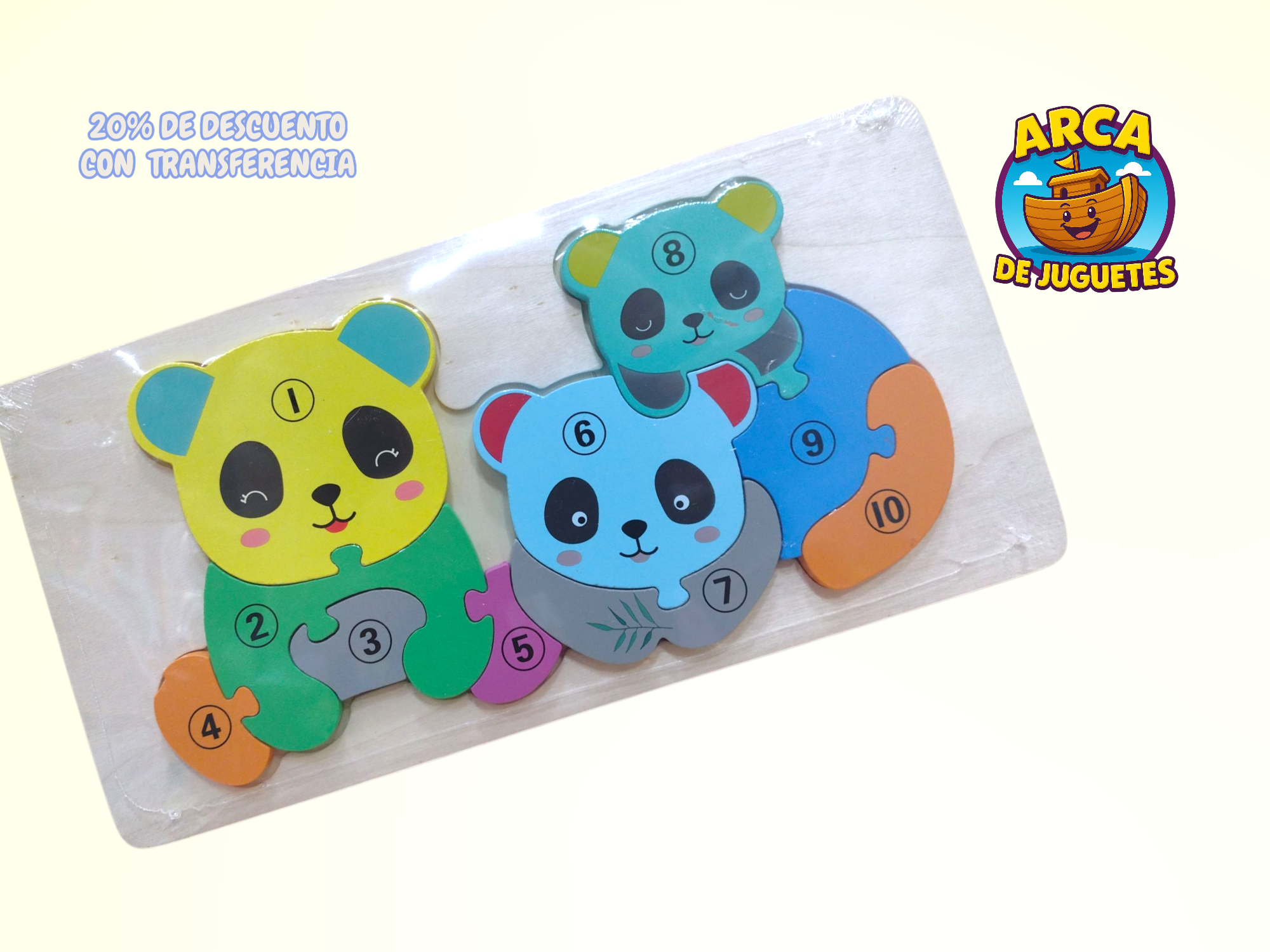 Cada pieza está numerada y pintada con colores vibrantes, ayudando a los niños a reconocer números, colores y formas mientras completan figuras de simpáticos animales 🦁🐢🐘.