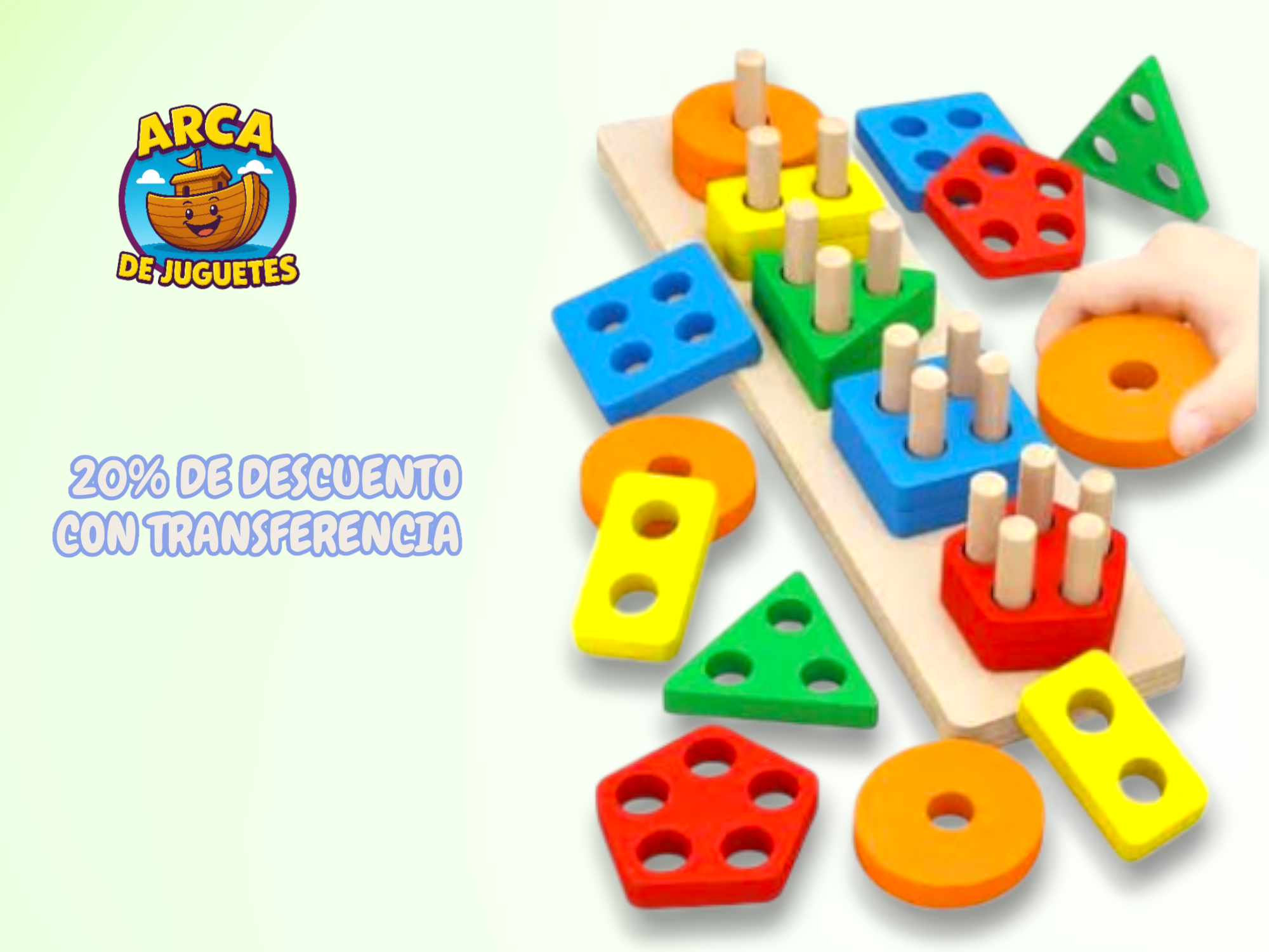 Incluye figuras geométricas de distintos colores que se encastran en su base de madera con pernos, para apilar y clasificar de mil maneras diferentes. Ideal para las primeras experiencias de aprendizaje a través del juego.