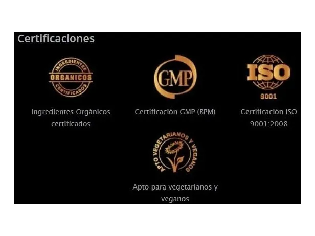 Certificaciones: Ingredientes Orgánicos certificados Certificación GMP (BPM) Certificación ISO 9001:2008