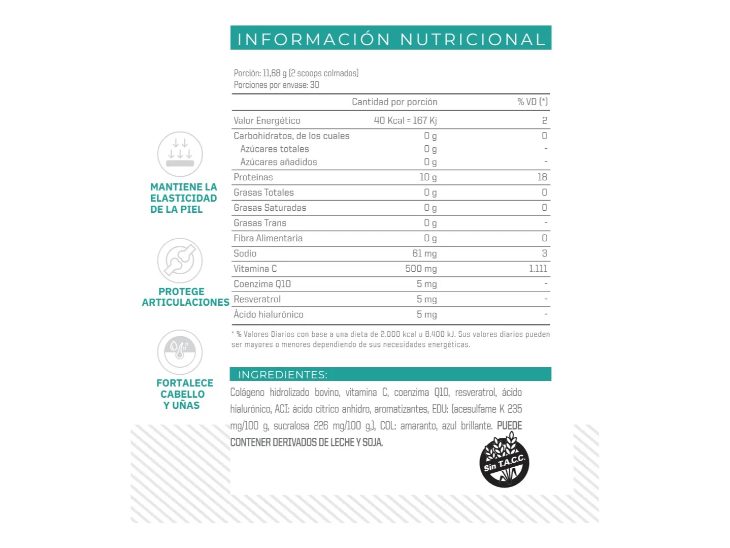 Este producto es libre de gluten y no contiene lactosa, lo que lo hace apto para personas con intolerancias alimentarias. Con un valor energético de 40Kcal por porción y un agradable sabor, Truemade Pure Collagen Ena Sport en Polvo es la elección perfecta para cuidar tu cuerpo de manera integral. Aprovecha sus beneficios y potencia tu rendimiento físico con este suplemento de calidad.