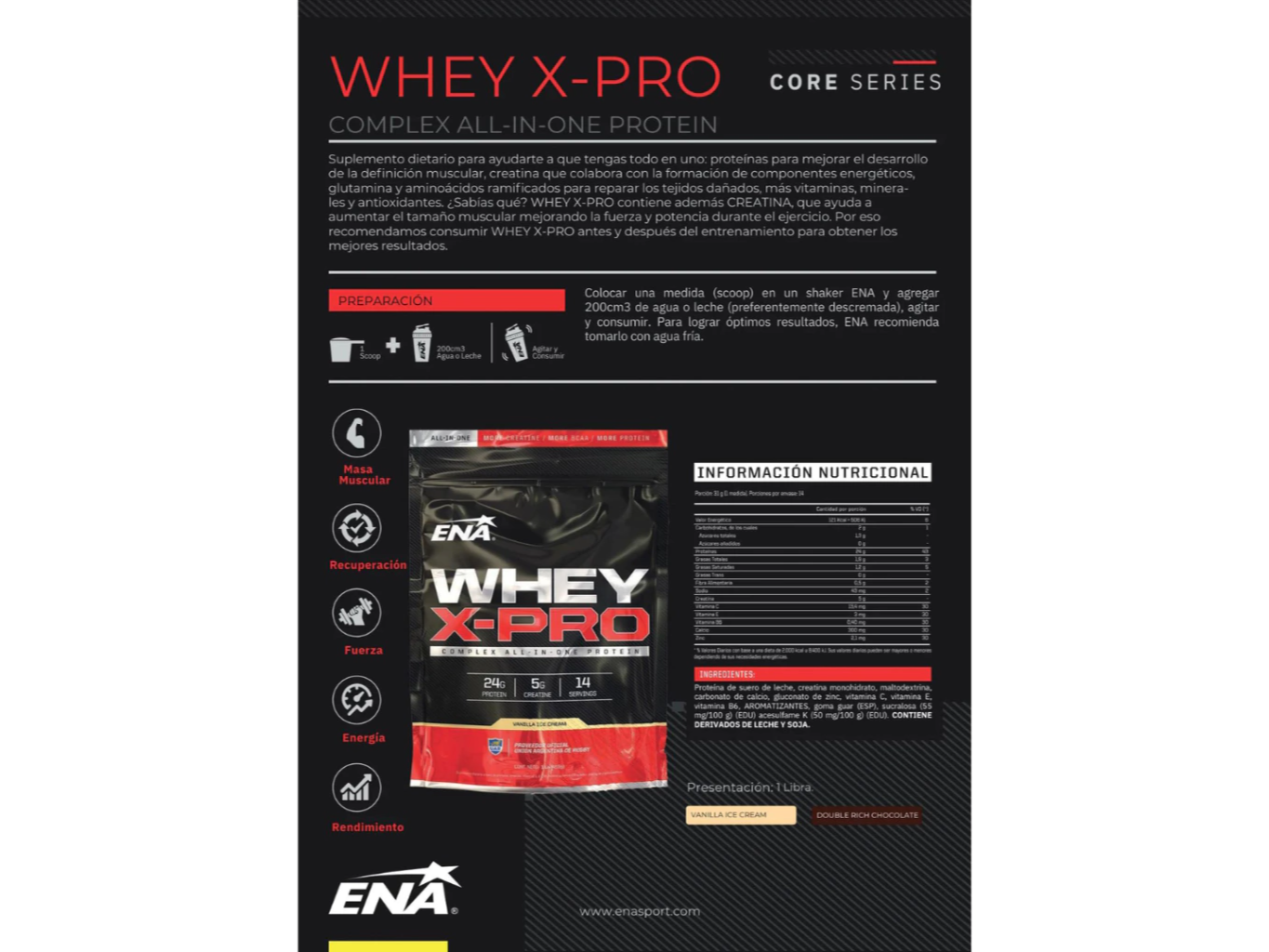 Whey X Pro Complex Protein aporta una combinación explosiva de proteínas, creatina, aminoácidos, vitaminas, minerales y antioxidantes, en una nueva fórmula mejorada. Aporta más sabor y una máxima disolución para lograr mejores resultados y la podés consumir antes o después del entrenamiento. Es la proteína de suero más avanzada del mercado (24 grs de proteína y 5 grs de creatina por medida (scoop).