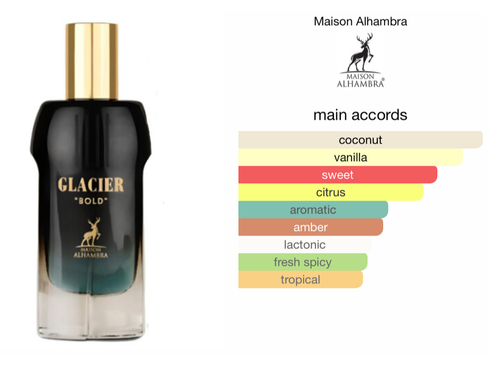 Glacier Bold de Maison Alhambra es una fragancia unisex vibrante y moderna que equilibra frescura, dulzura tropical y calidez amaderada. Su salida es chispeante y energética, con una mezcla de piña jugosa, iris empolvado, jengibre especiado y el toque verde del ciprés, que aportan una apertura fresca y sofisticada. En el corazón, el coco se une a notas amaderadas suaves, creando una sensación cremosa, tropical y elegante. El fondo es cálido y envolvente: haba tonka, sándalo, ámbar y ámbar gris construyen una base duradera y sensual, con un equilibrio entre dulzura y profundidad. Ideal para destacar con estilo en climas templados o cálidos, con una personalidad luminosa y actual.