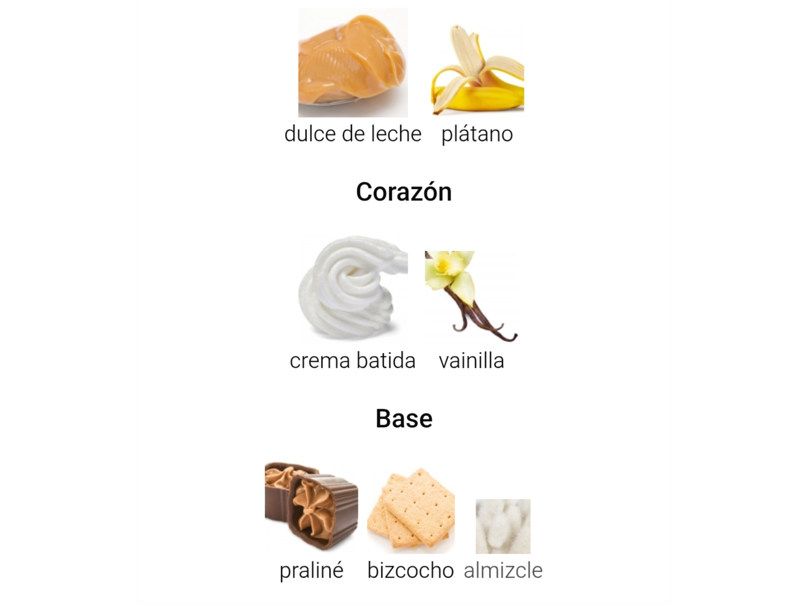 Descripción: Las Notas de Salida son dulce de leche y plátano; las Notas de Corazón son crema batida y vainilla; las Notas de Fondo son bizcocho, praliné y almizcle.