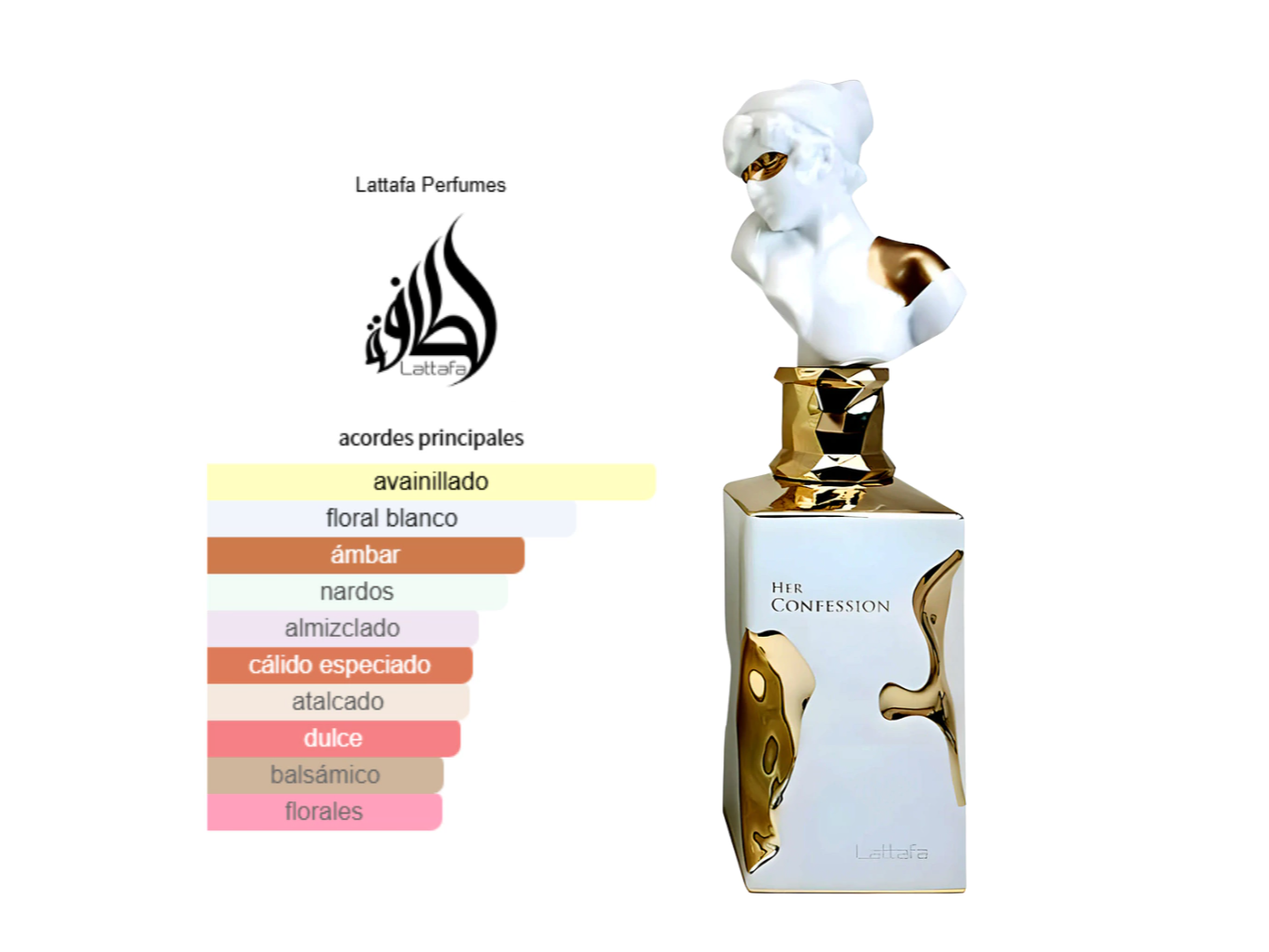 Her Confession de Lattafa es una fragancia que captura la esencia de la seducción y el misterio en un perfume femenino intrigante y sofisticado. Desde el primer momento, su apertura especiada con un acorde místico y canela crea un aura envolvente y cálida, preparando el escenario para un corazón floral y profundo. Aquí, el nardo y el jazmín se combinan con el incienso, aportando una sensación mística y envolvente, mientras que el Mahonial añade un toque moderno y brillante.