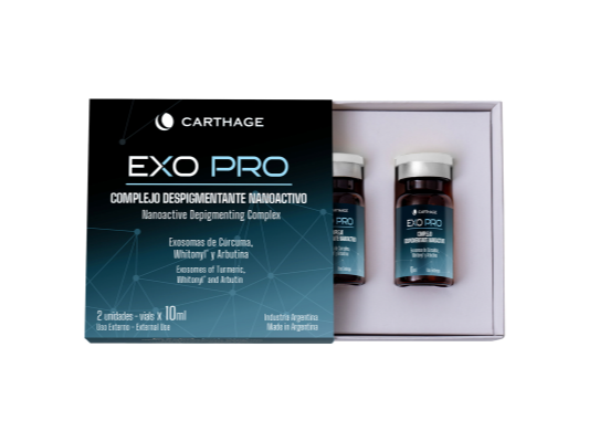A partir de este enfoque biotecnológico, CARTHAGE EXO PRO ofrece una solución integral para el tratamiento de manchas: el Complejo Despigmentante Nanoactivo, una fórmula que combina Exosomas de Cúrcuma, capaces de contribuir al aclaramiento del tono y de estimular los mecanismos naturales de defensa cutánea, favoreciendo la hidratación, el fortalecimiento de la piel y su resistencia frente al estrés.