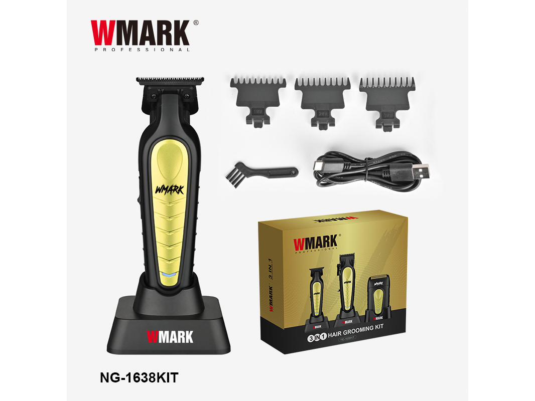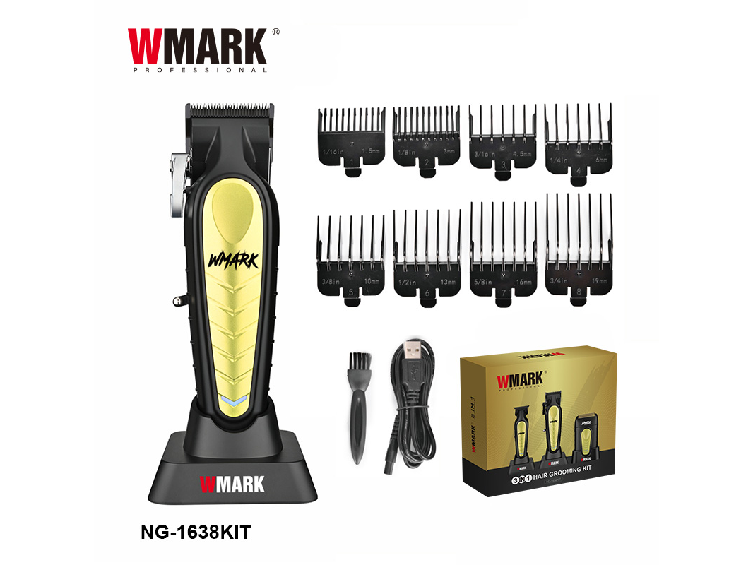 Accesorios: 3 peines guía (1/2/3mm), cepillo de limpieza, aceite lubricante, cable de carga USB y soporte de carga.