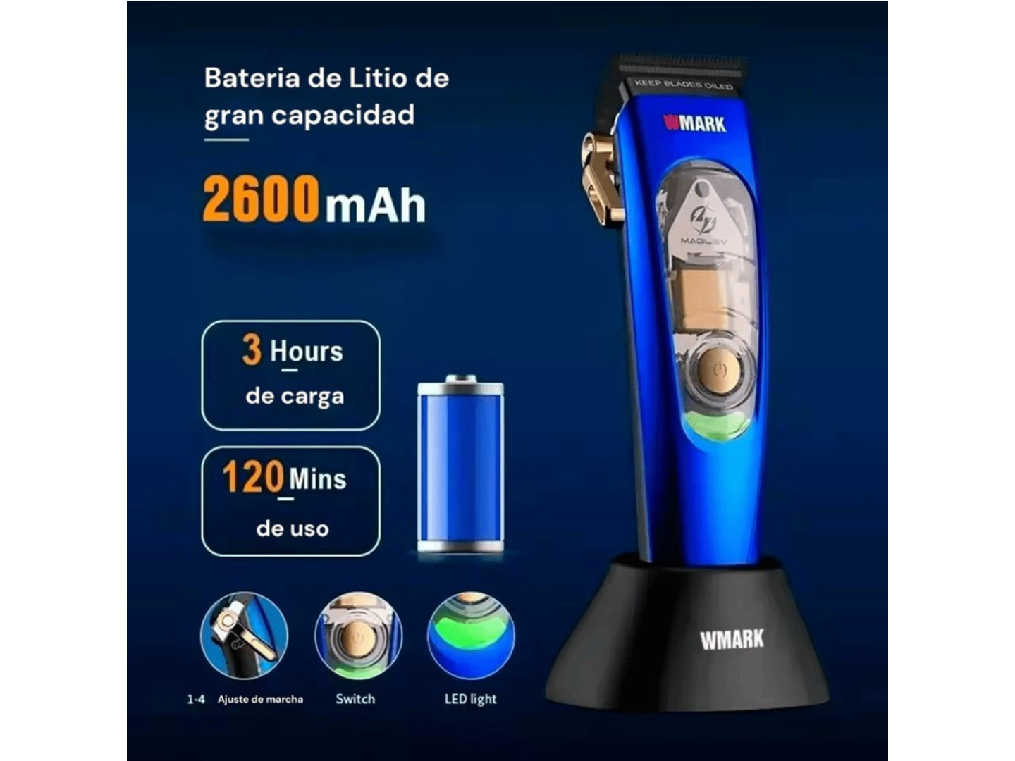 -Batería de litio: 2600mAh, 3 horas de carga completa y 120 minutos de uso continuo.