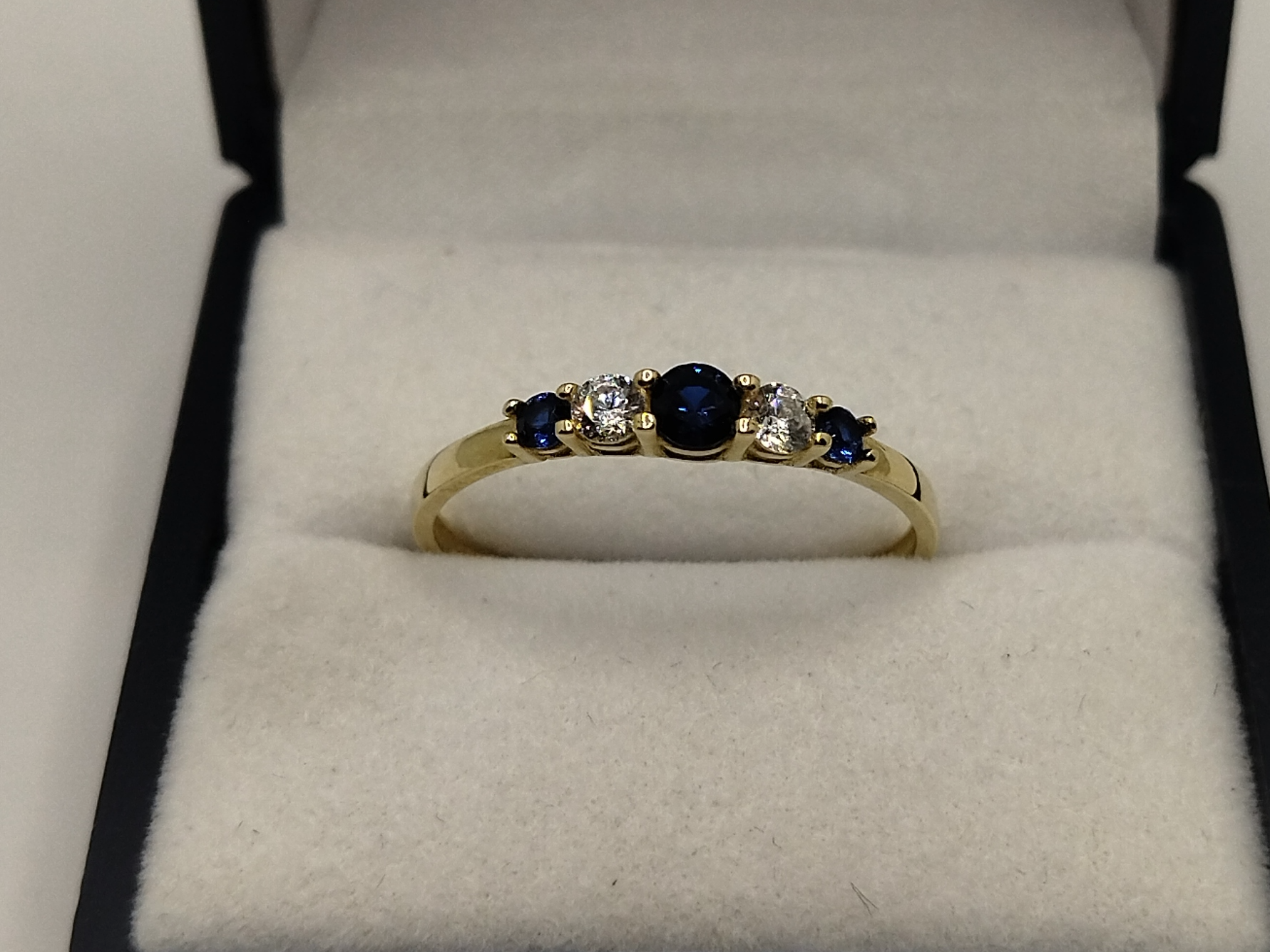 Anillo cintillo promesa oro 9k Italiano circonia blancas y azules