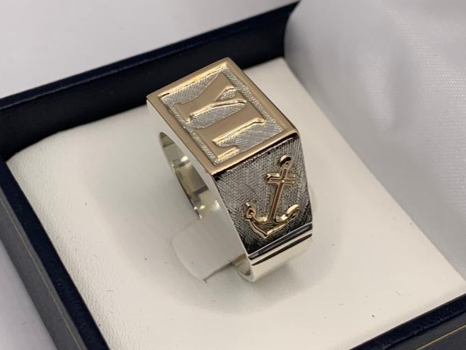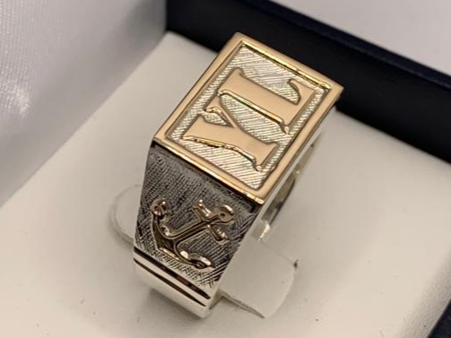 Anillo sello de hombre 12 x 16 con Ancla) Compartir por WhatsApp Copiar enlace Anillo sello de hombre 12 x 16 mm. Con marco, apliques e iniciales en oro.$9.990 Observaciones 0 / 150