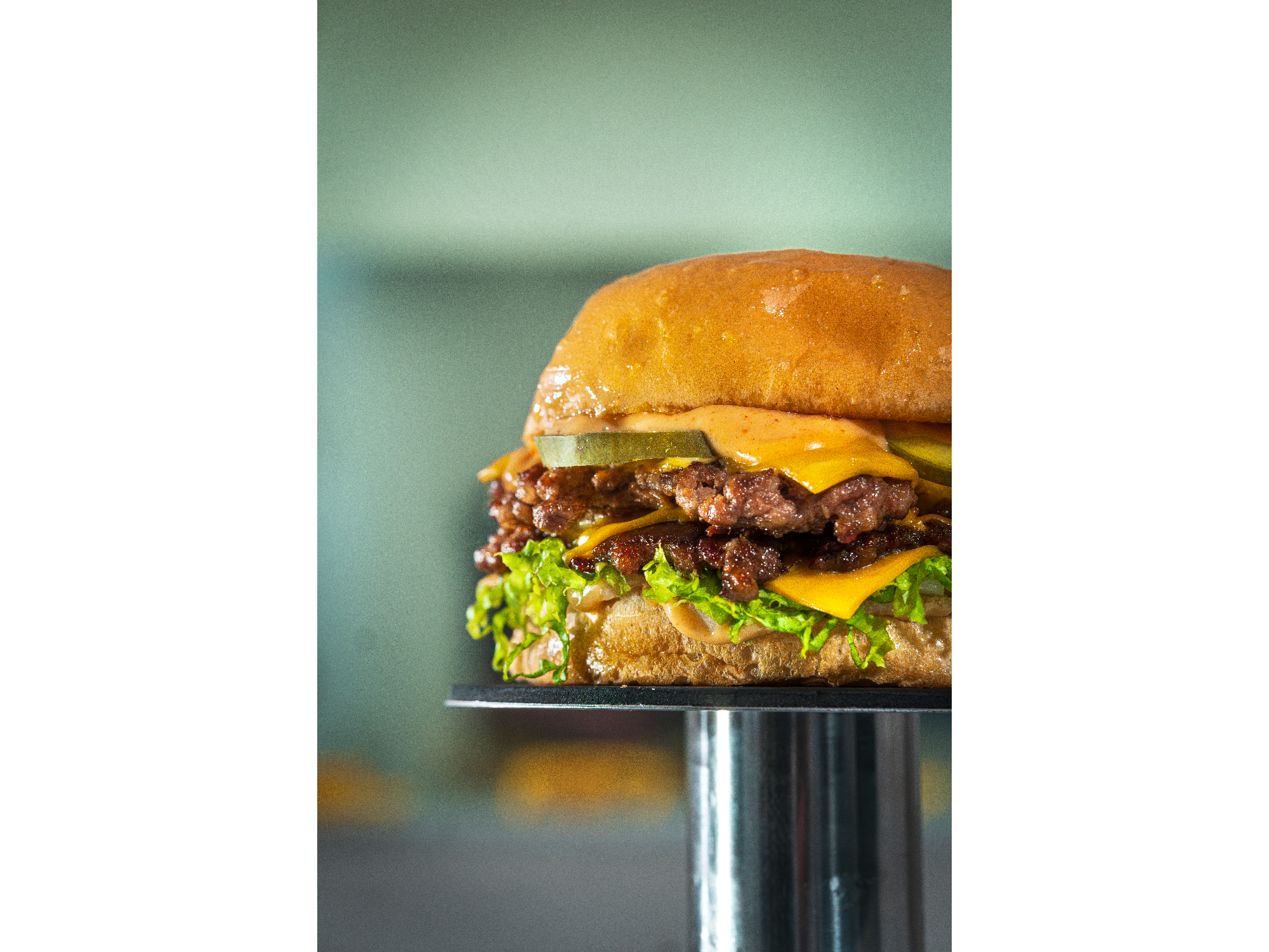Pan dividido en 3, dos medallones de carne, dos fetas de cheddar, lechuga, cebolla picada, pepino, nuestra salsa especial y papas
