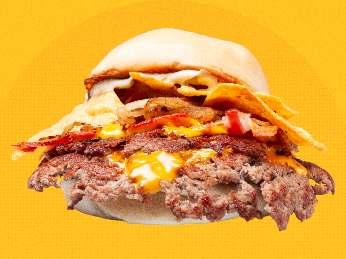 👉🏻 Pan de papa, doble smash Blend Benny de 100gr, dos fetas de cheddar, cebolla caramelizada, bacon, doritos, salsa Sweet Benny y porción de papitas gratis. 🍔🔥💛