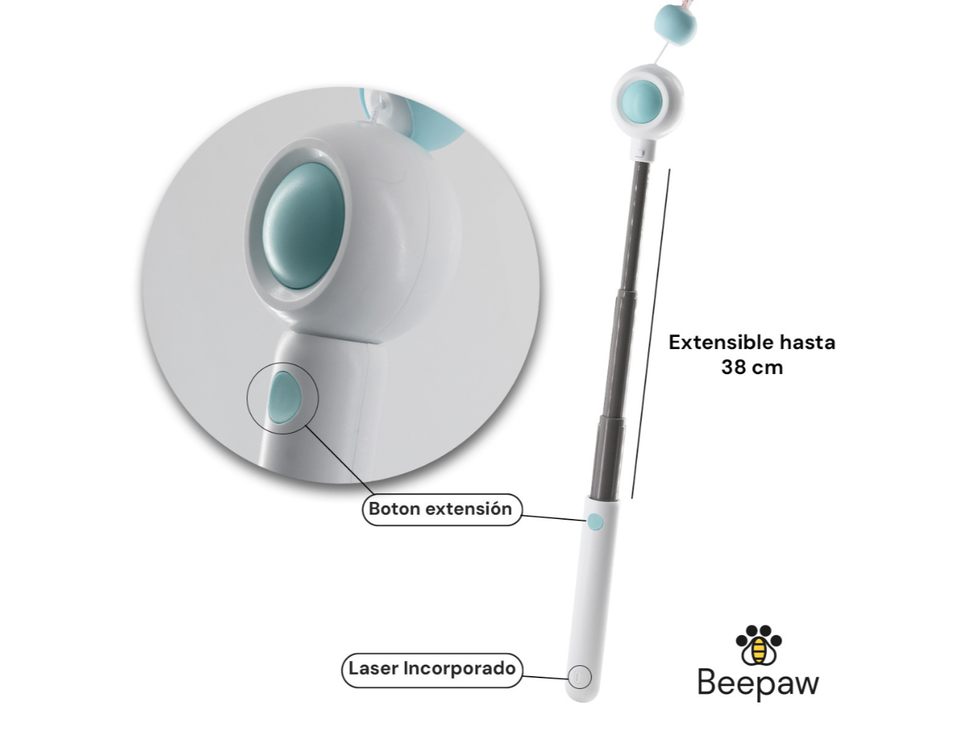 Varilla extensible para juego interactivo con gatos. Permite acoplar plumas o juguetes en el extremo, simulando movimiento de presa. Estimula el ejercicio físico y refuerza el vínculo con el tutor.