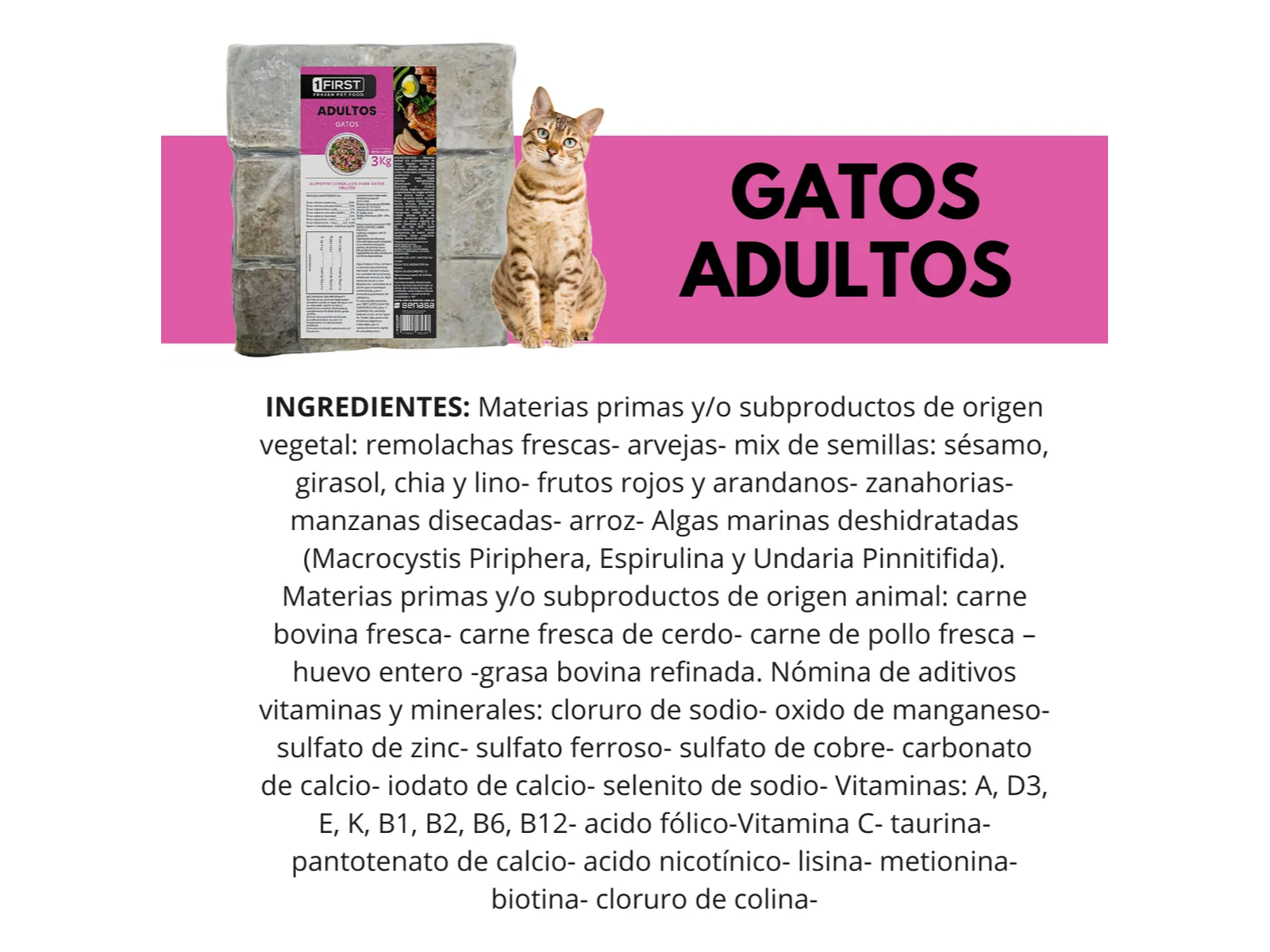 65008FIRST CONGELADO GATO ADULTO 3KG Compartir por WhatsApp Copiar enlace Alimento completo y natural para gatos adultos. Contiene carnes frescas, huevo, vegetales y algas marinas que aportan proteínas digestibles y antioxidantes. Ayuda a mantener energía, peso ideal y salud digestiva.$41.450 Observaciones 0 / 150