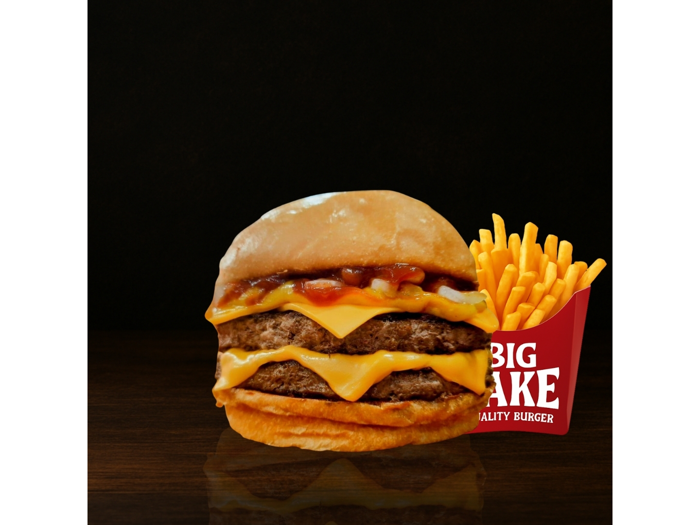 Pan de papa artesanal, Carne 100% vacuna, Cheddar Milkaut Feteado, Salsa Cuarto de Libra, Cebollita