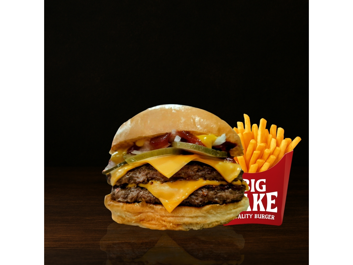 Pan de papa artesanal, Carne 100% vacuna, Cheddar Milkaut Feteado, Salsa Cuarto de Libra, Cebollita, Pickles de pepinos