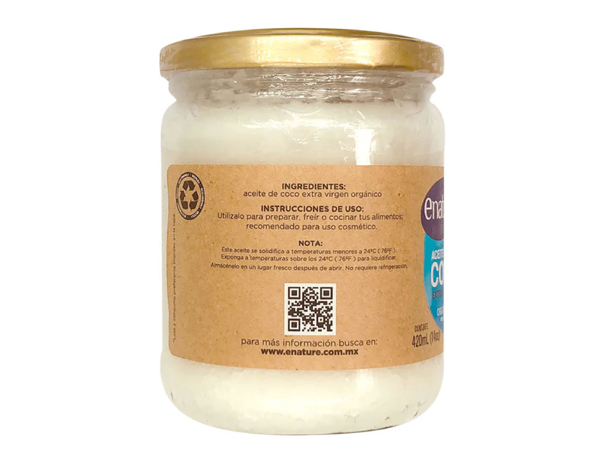 El Aceite de Coco Extra Virgen Orgánico Enature 420 ml es un producto natural obtenido mediante prensado en frío