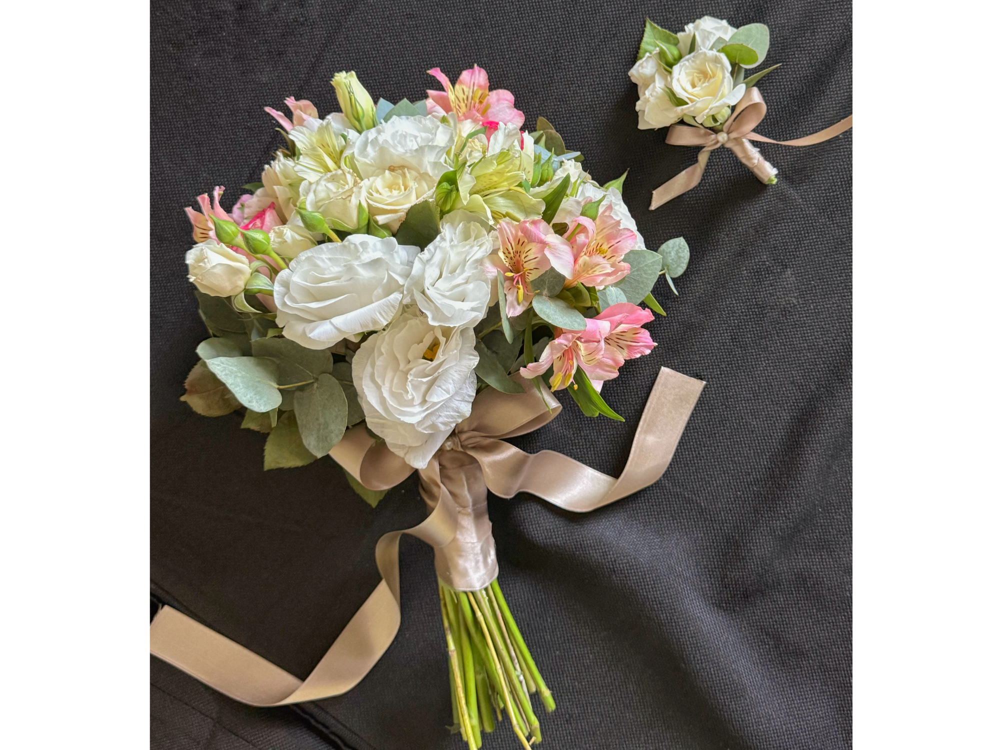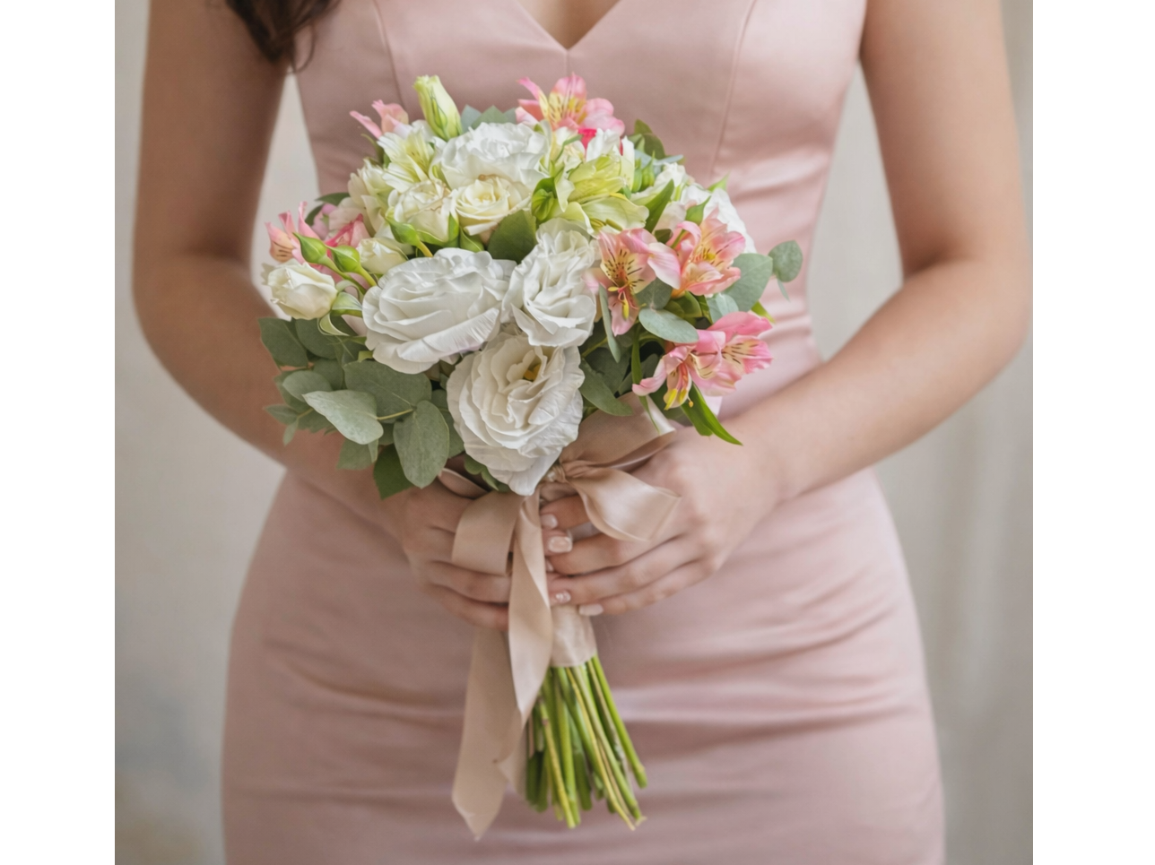 Está compuesto por lisianthus de textura etérea, astromelias en tonos suaves, rosas spray que aportan dulzura y volumen, y un sutil follaje de eucaliptus que equilibra el conjunto con frescura natural.