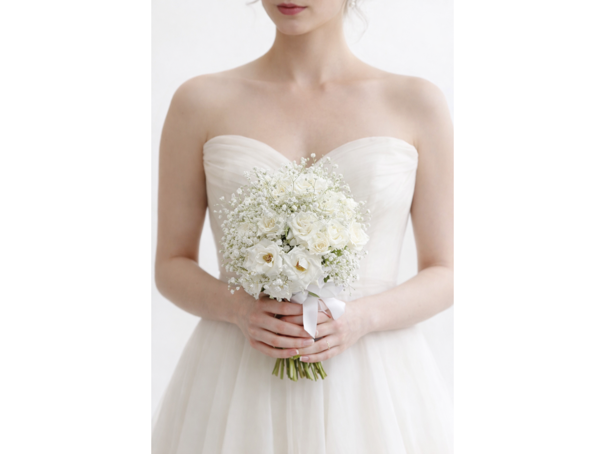 Está pensado para novias que buscan un bouquet sutil y armonioso, con una terminación prolija en tallos descubiertos y lazo de raso que le aporta un toque fino y clásico.