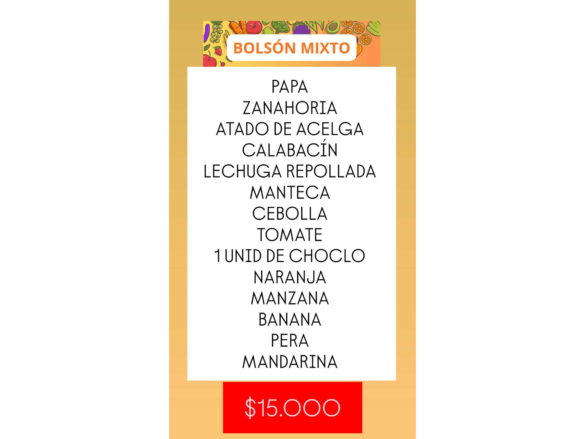 BOLSONES DE LA SEMANA Compartir por WhatsApp Copiar enlace MIXTO $15.000 FRUTAS $10.500 VERDURA $9.000
