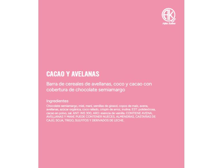 Cacao y Avellanas Compartir por WhatsApp Copiar enlace Barra de cereales de avellanas, coco y cacao con cobertura de chocolate semiamargo.$1.600 Observaciones 0 / 150