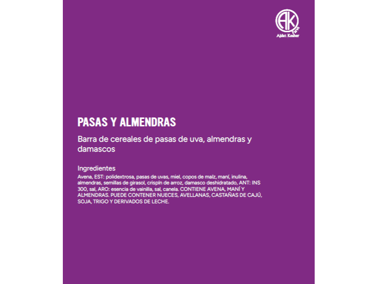 Pasas y Almendras Compartir por WhatsApp Copiar enlace Barra de cereales de pasas de uva, almendras y damascos$1.600 Observaciones 0 / 150