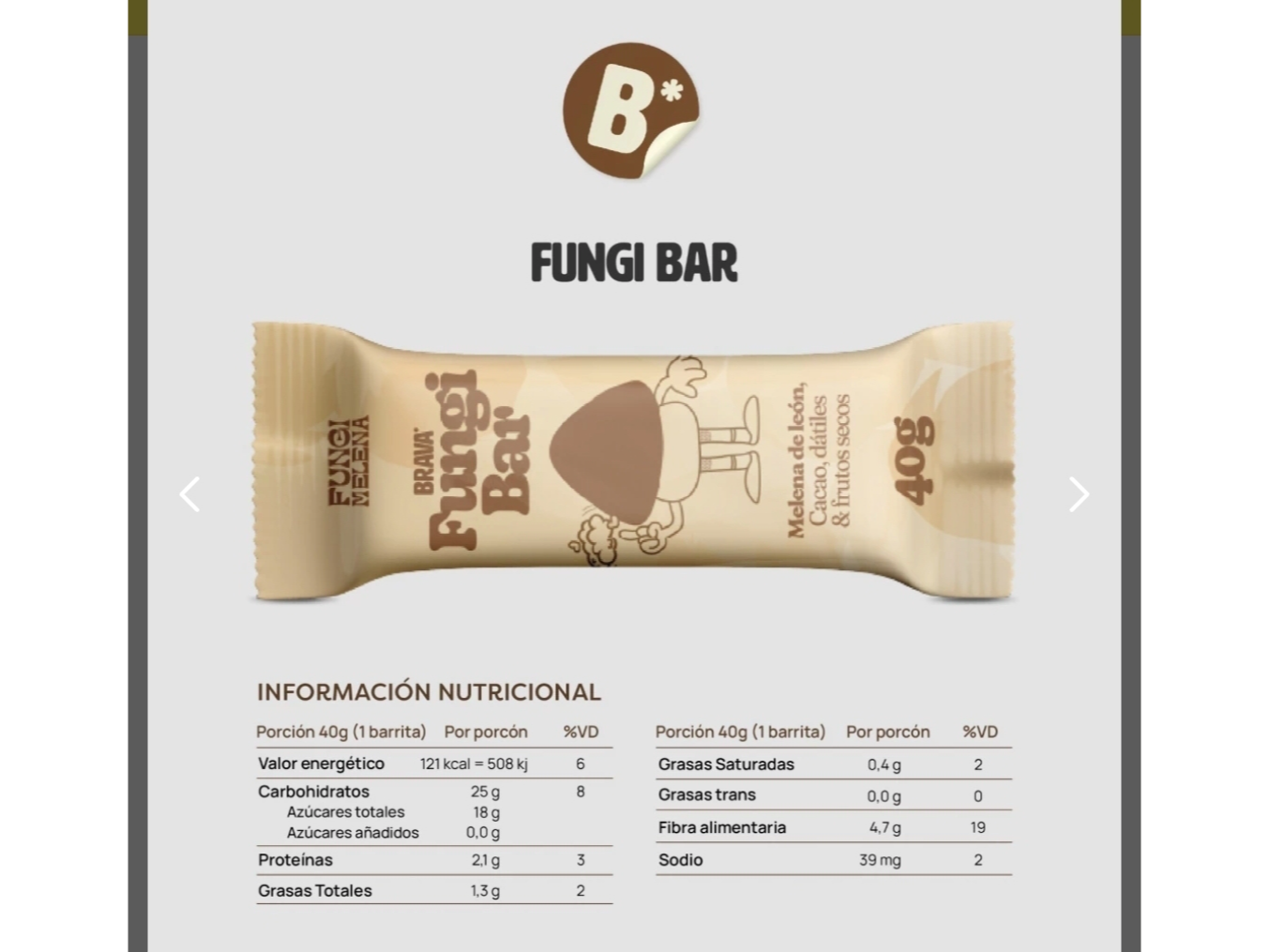 Proba nuestra Fungi Barra elaborada 100% con ingredientes naturales, a base de dátiles, cacao, frutos secos y 2 Gr. de Melena de león.