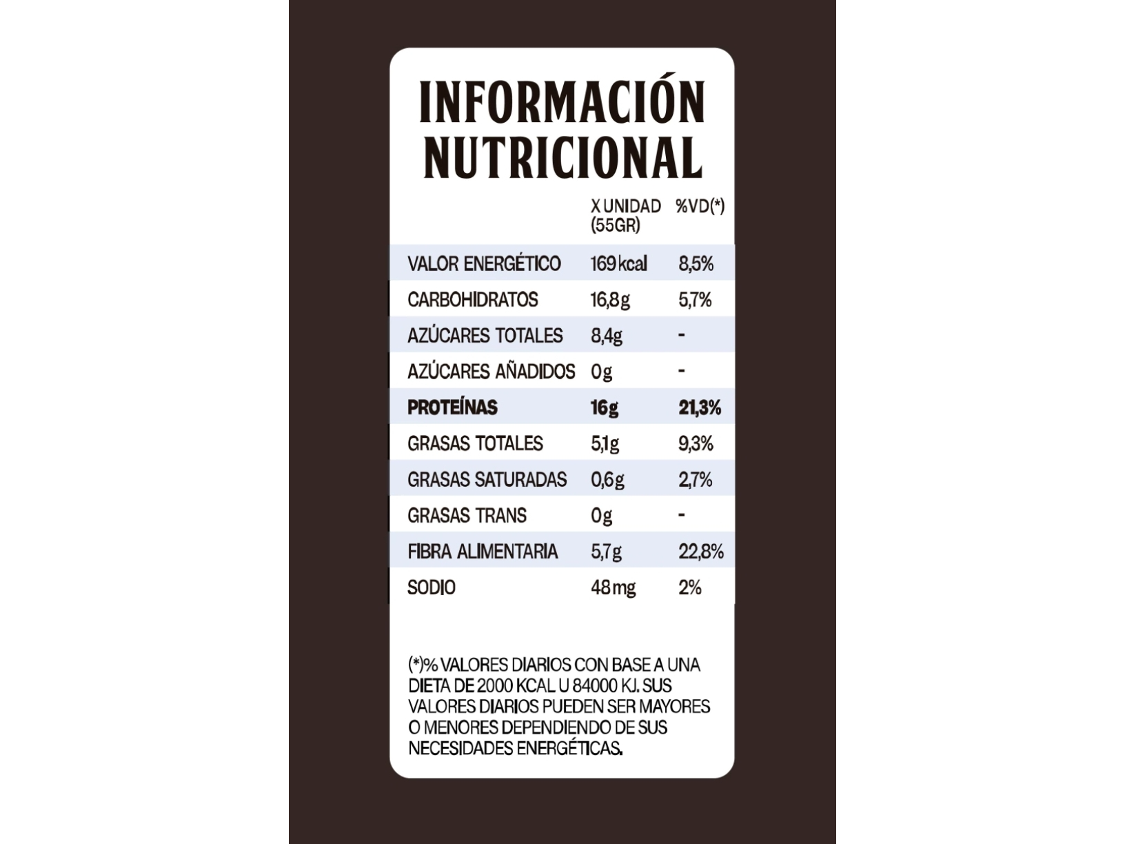 Ingredientes: proteína aislada de arvejas, dátiles, pasas de uva, almendras, castañas de cajú, maní, cacao