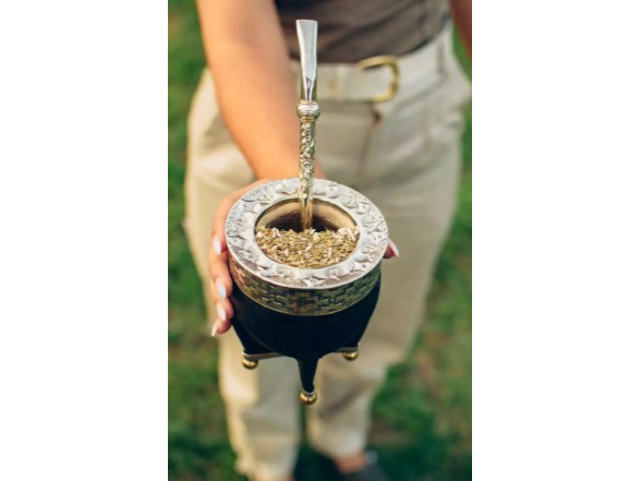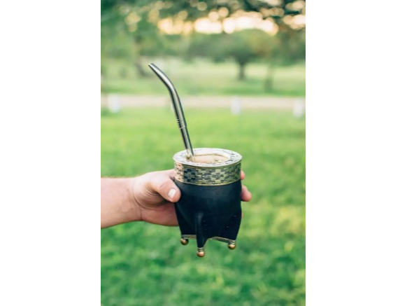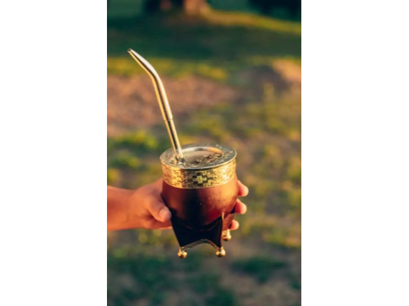 Hecho a partir de porongo natural, con cuero genuino terminado con una base, fleje y virola de alpaca, es una pieza que combina tradición, elegancia y carácter. Además, las bolitas de bronce decorativas aportan un detalle único que eleva su presencia. La bace al ser de alpaca, aporta resistencia.