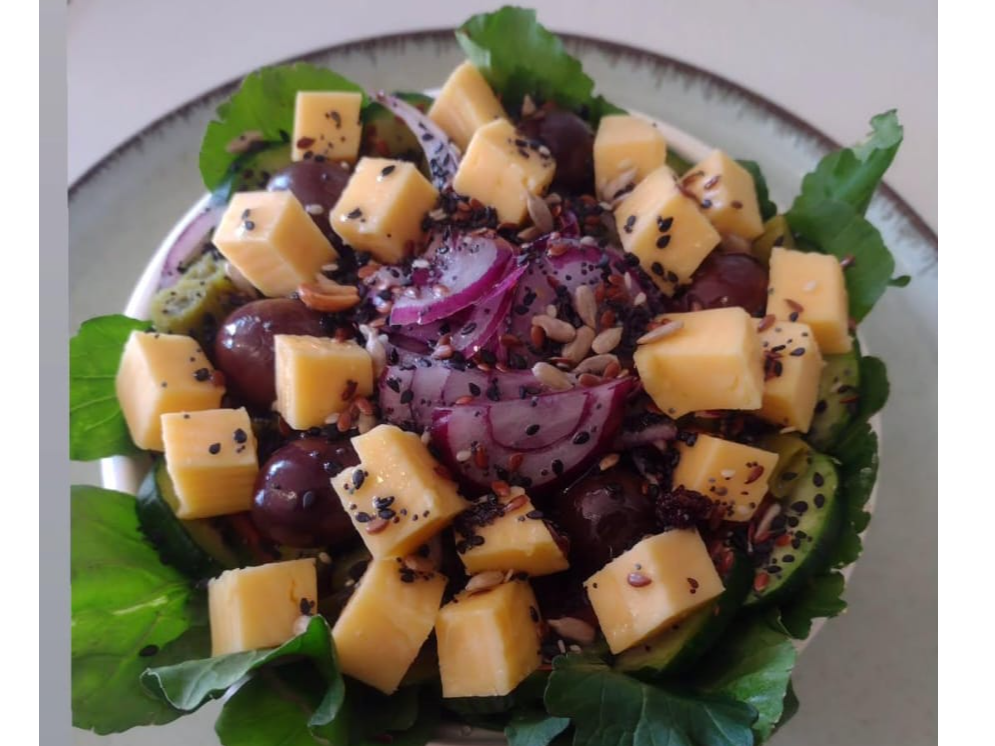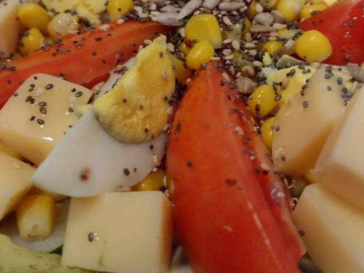 ensalada de lechuga, tomate, palta, zanahoria, pepino, lenteja, repollo morado, choclo, y oliva extravirgen
