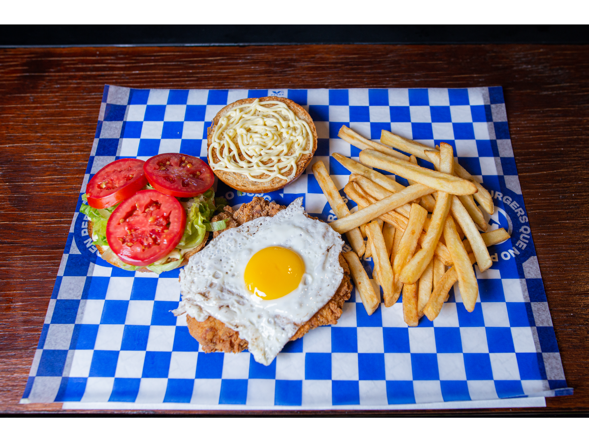 BULL CHICKEN Compartir por WhatsApp Copiar enlace (POLLO CRISPY, LECHUGA, TOMATE, HUEVO FRITO Y SALSA ALIOLI). INCLUYE PAPAS$13.799 Observaciones 0 / 150