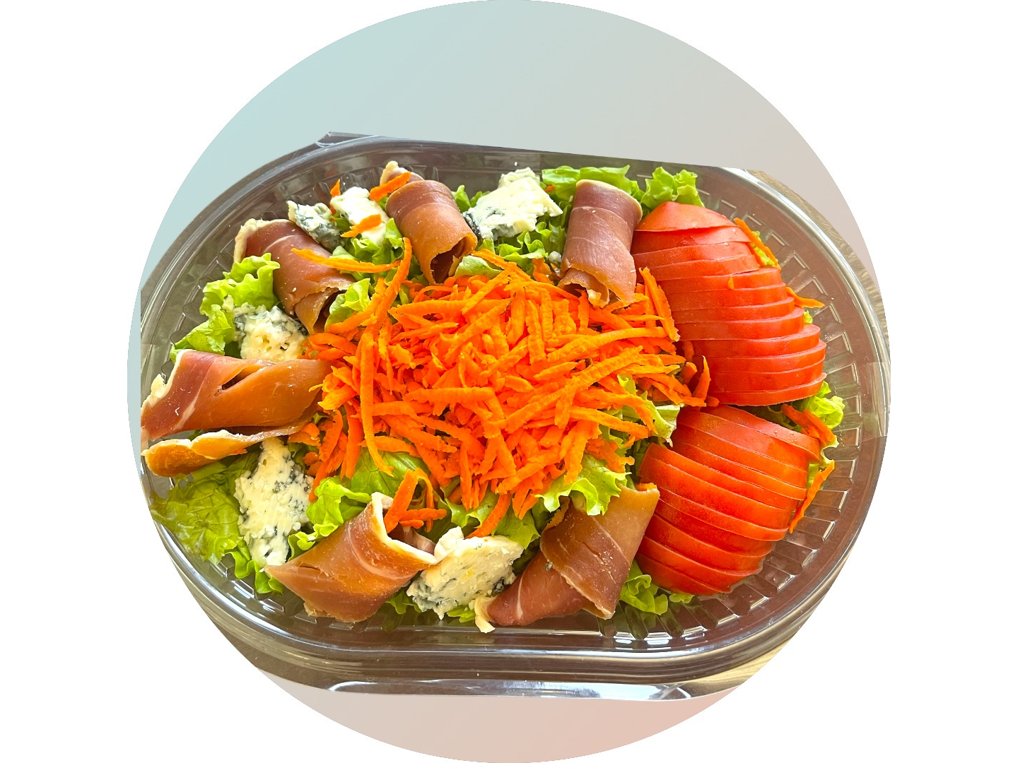 Lechuga, tomate, zanahorias, queso roquefort y jamón crudo
