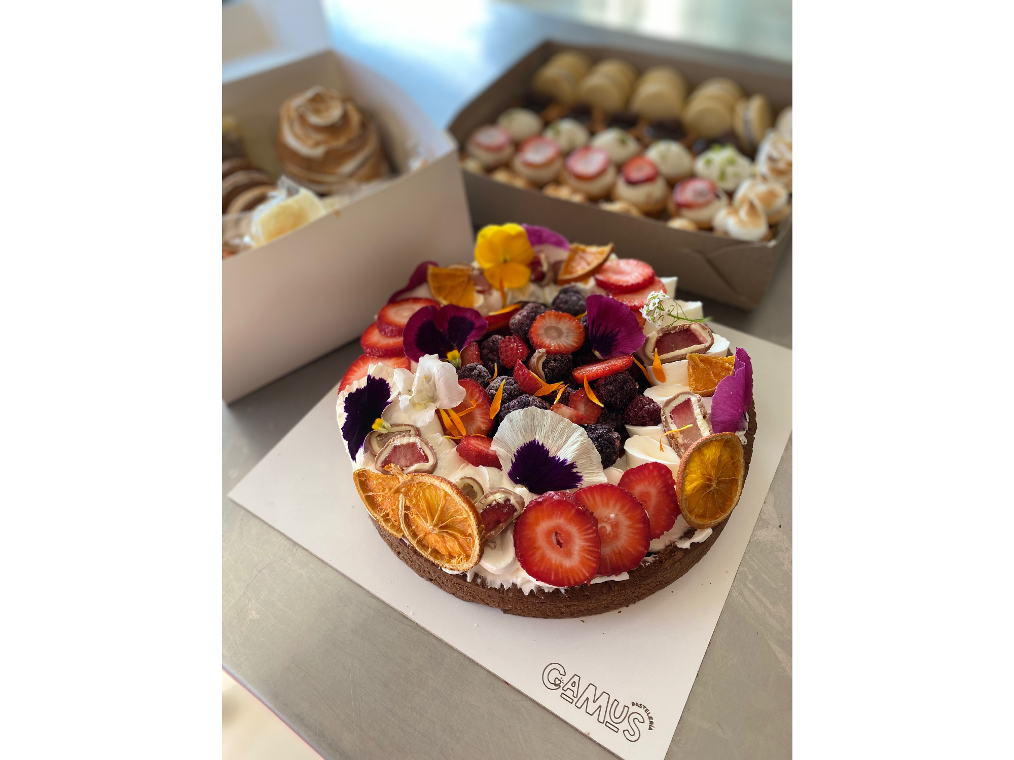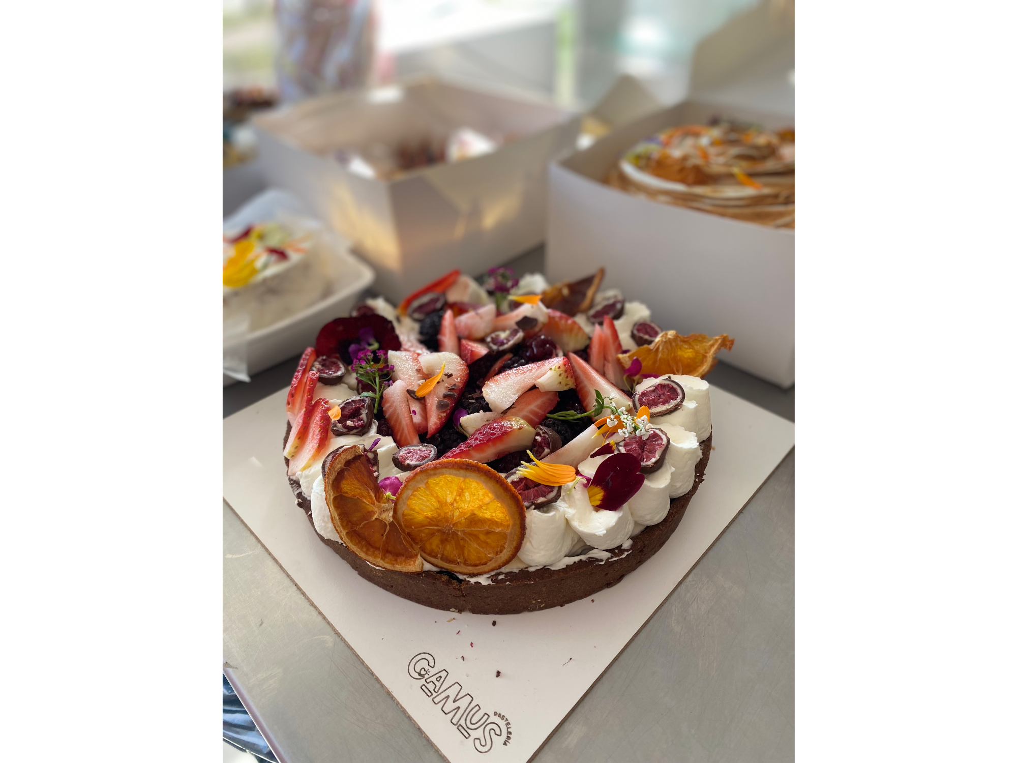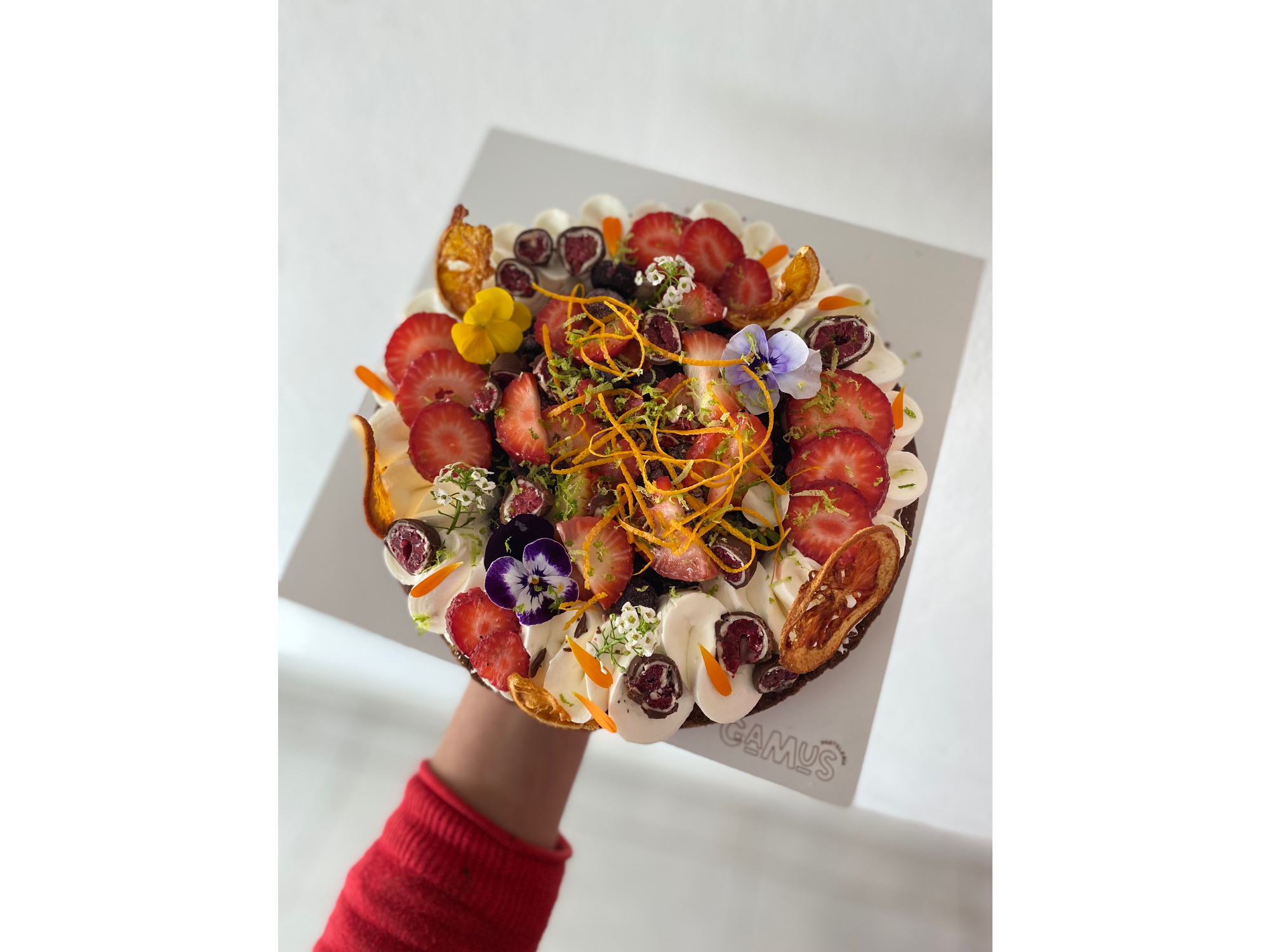 Base sablee de chocolate , relleno de doble ganache montada de chocolate con leche y blanco , reducción de frutos rojos , crema chantilly , mas frutos rojos y frambuesas o frutillas bañadas en doble chocolate