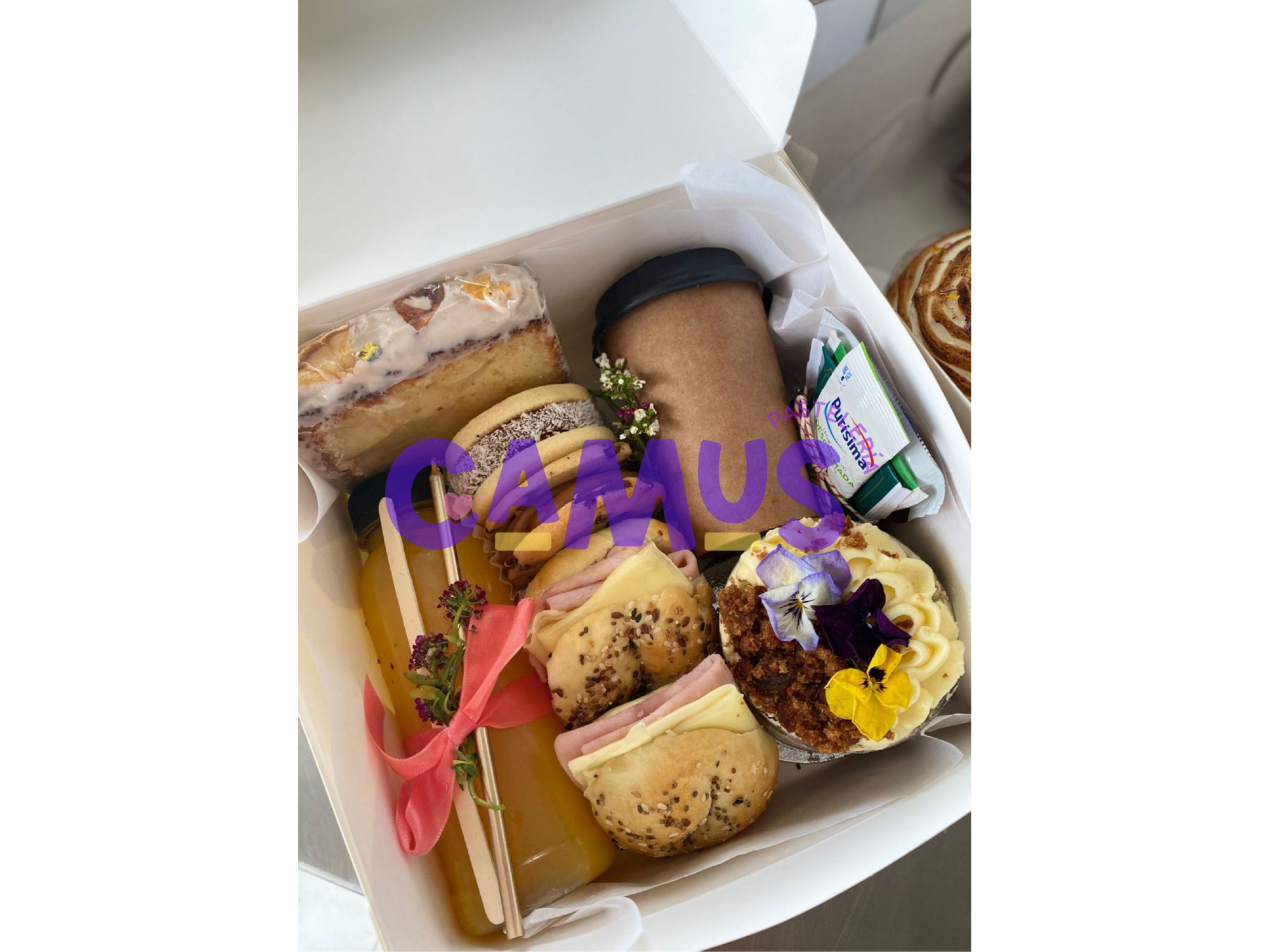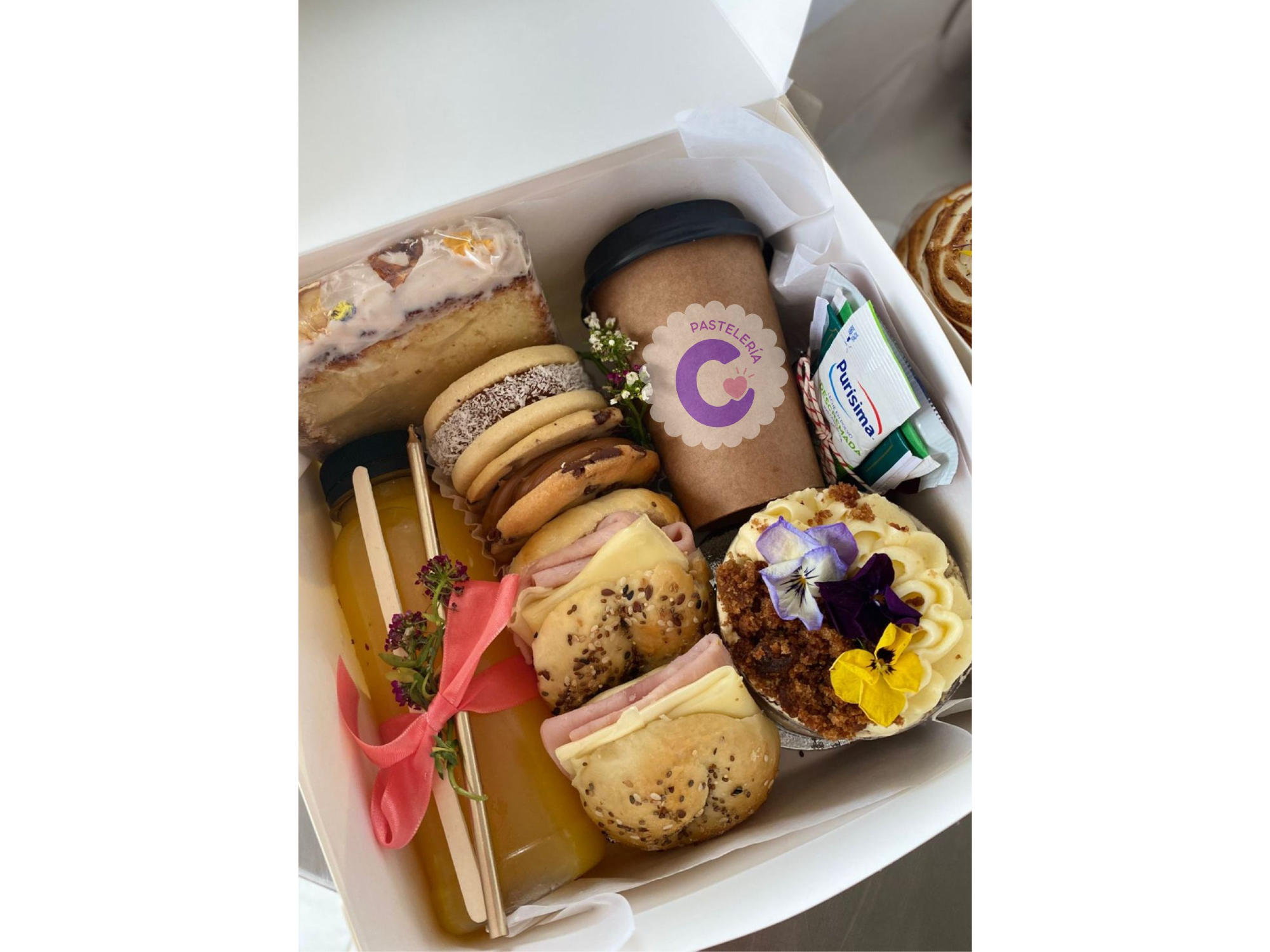 BOX MIMO Compartir Que tiene : -Jugo de naranja -2 Sandwich de pan baguel caserito -1 Cuadrado de budin o de frolla -Mini torta chocotorta , podes cambiar de variedad por costo adicional -2 Alfajores surtidos grande con mucho dulce de leche -Vaso descartable de café Presentada en caja blanca y tarjeta para mensajito$26.500 Personalizá tu selección Las siguientes opciones aplican para cada producto agregado. Elegí la bebida Seleccioná una opción. Obligatorio Jugo de naranjaLimonada$2.000Cerveza Según stock disponible $2.300Lata de coca cola$1.500Lata de Sprite$1.500Chocolatada$2.500 BENTO CAKE Seleccioná una opción. Obligatorio SIN BENTO CAKEBENTO FELIZ CUMPLE Bizcochuelo de vainilla , relleno de dulce de leche y cubierta de buttercream. Con frase " feliz cumple " deco simple y color blanco $8.500BENTO "TE AMO" Bizcochuelo de vainilla , relleno de dulce de leche y cubierta de buttercream. Con frase " TE AMO " deco simple y color blanco $8.900BENTO FLORES Bizcochuelo de vainilla , relleno de dulce de leche y cubierta de buttercream. Deco en color blanco y flores comestibles $9.500 Elegi tu mini torta Seleccioná una opción. Obligatorio chochotortaRogel$2.500red velvet$2.500carrot cake$2.500key lime pie$2.500brownie fr rojos$2.500 Kit cumpleaños Seleccioná las opciones que quieras.SIN KIT CUMPLEAÑOSVela simple$1.200Vengala$2.400Vela + Vengala$3.500Vela y topper feliz cumple$2.000Globo metalzado$2.000 OTROS EXTRAS Seleccioná hasta 2 opciones.SIN EXTRAInfusiones varias$1.000Vaso termico$7.000Taza de cerámica varios modelos Podés consultarnos las opciones de diseño disponibles $7.500Mate más bombilla$7.000 Observaciones 0 / 150