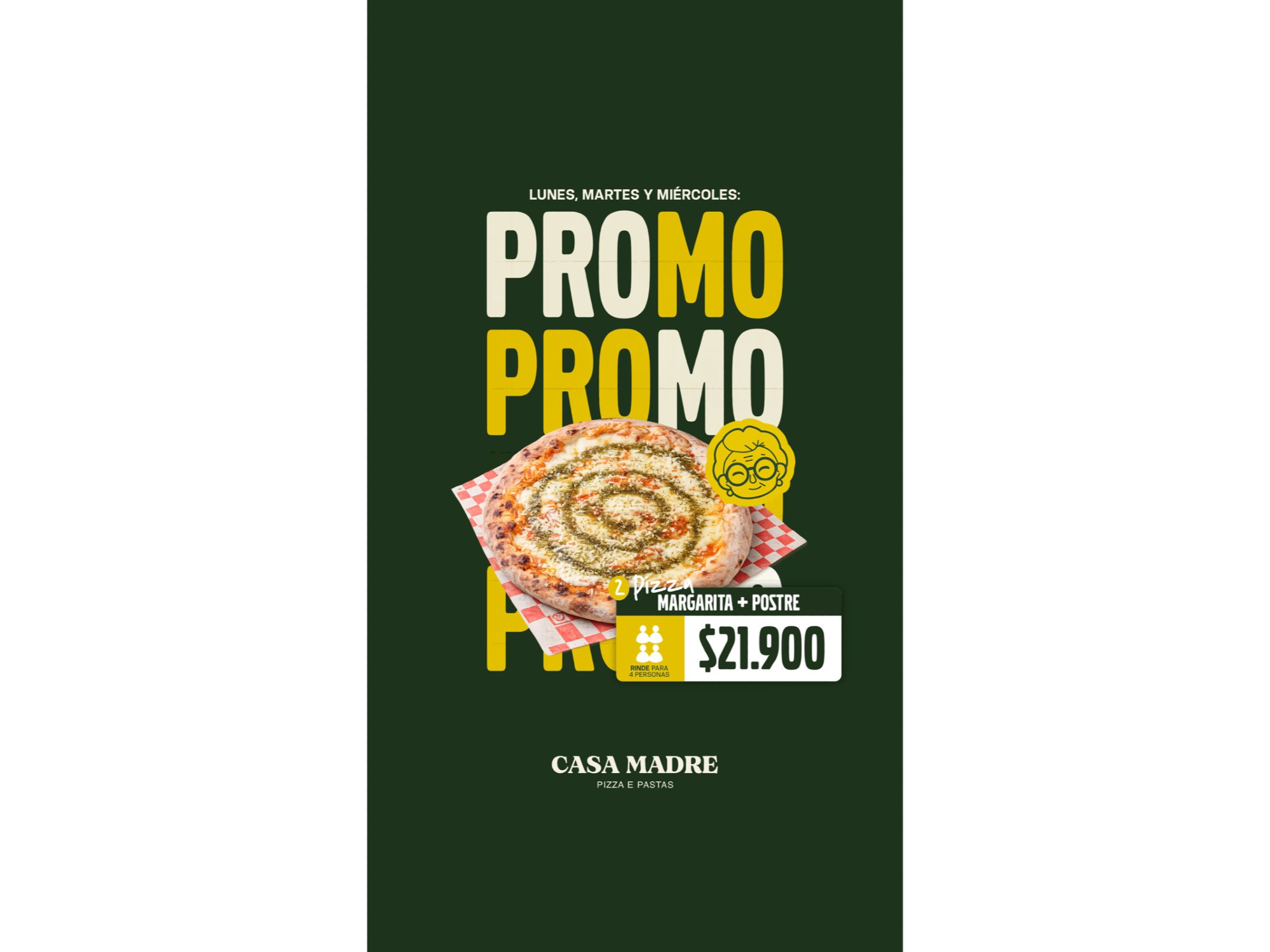 PROMOCIONES Compartir por WhatsApp Copiar enlace PROMO LUNES, MARTES Y MIERCOLES. PROMO JUEVES Y VIERNES. PROMO LUNES, MARTES Y MIERCOLES. (3) MARGARITA X 2 + POSTRE CASA MADRE $37.000$21.900 41% OFF FUGAZZETA X 2 + POSTRE CASA MADRE $40.000$21.900 45% OFF SANDWICH + 2 BEBIDAS SIN ALCOHOL. 500ML $19.090$14.900 22% OFF PROMO JUEVES Y VIERNES. (2) PIZZA NEOYORQUINO + POSTRE CASA MADRE $23.999$16.900 30% OFF NEOYORQUINO $22.000$15.490 30% OFF